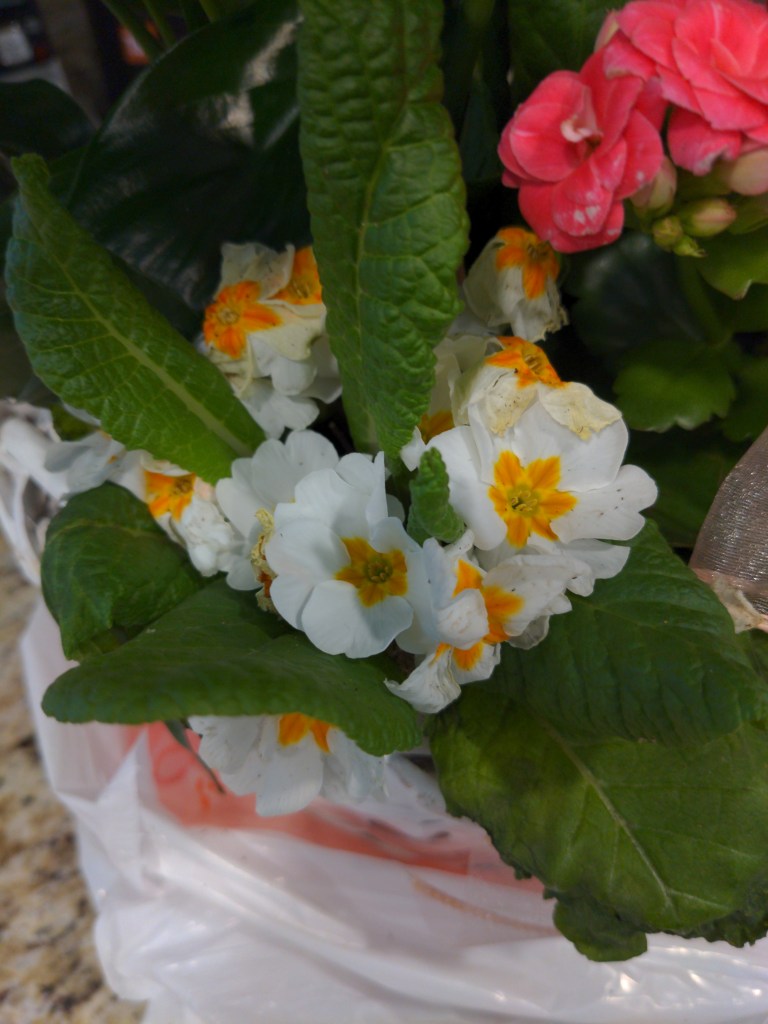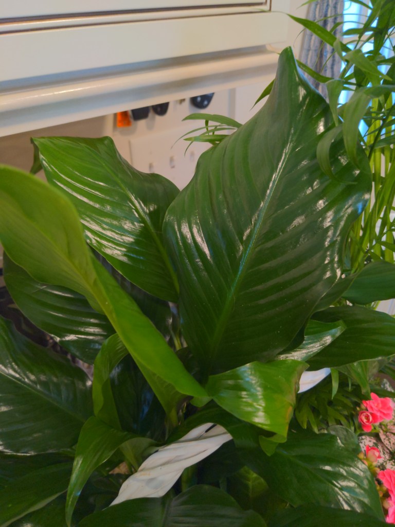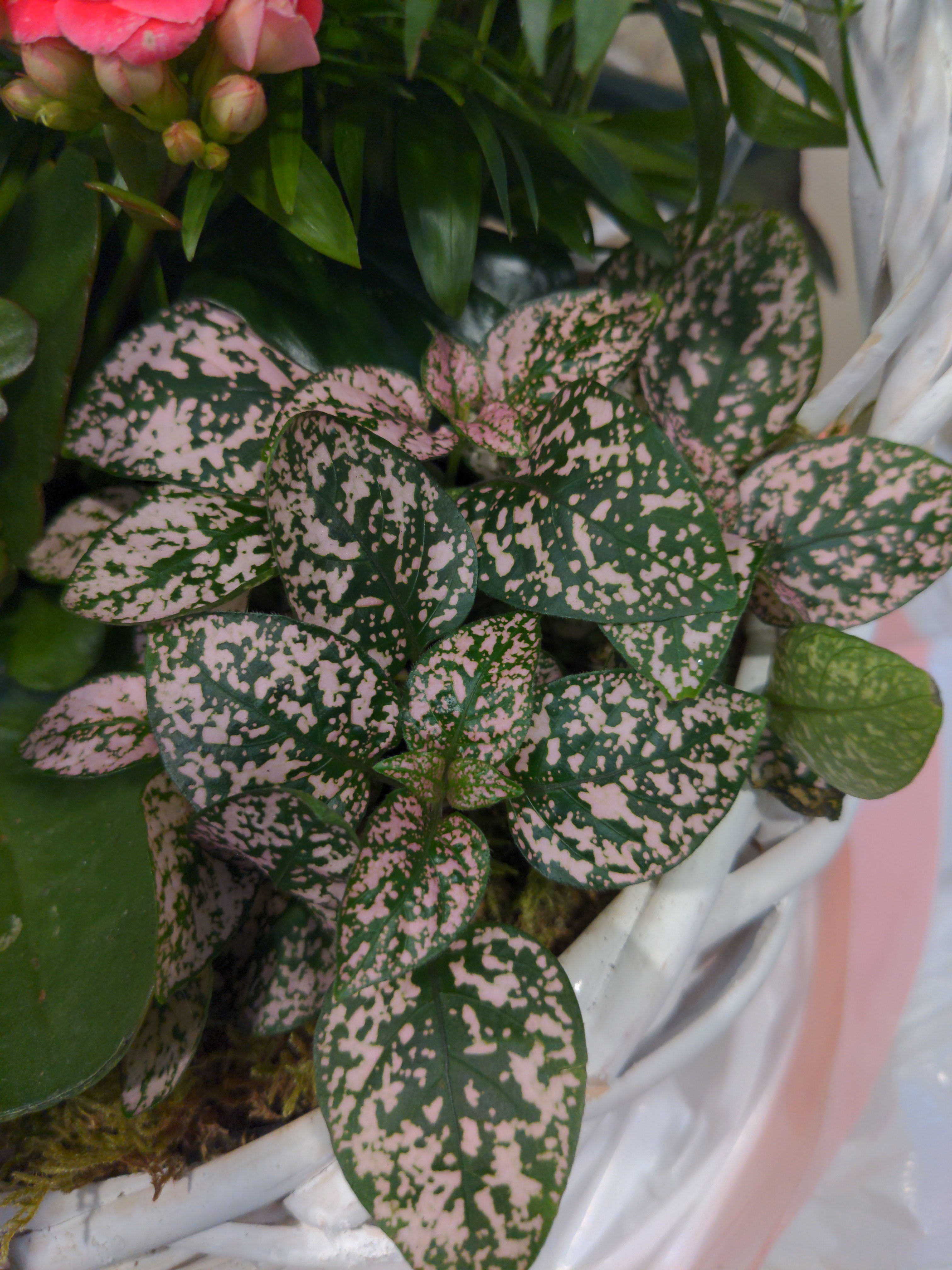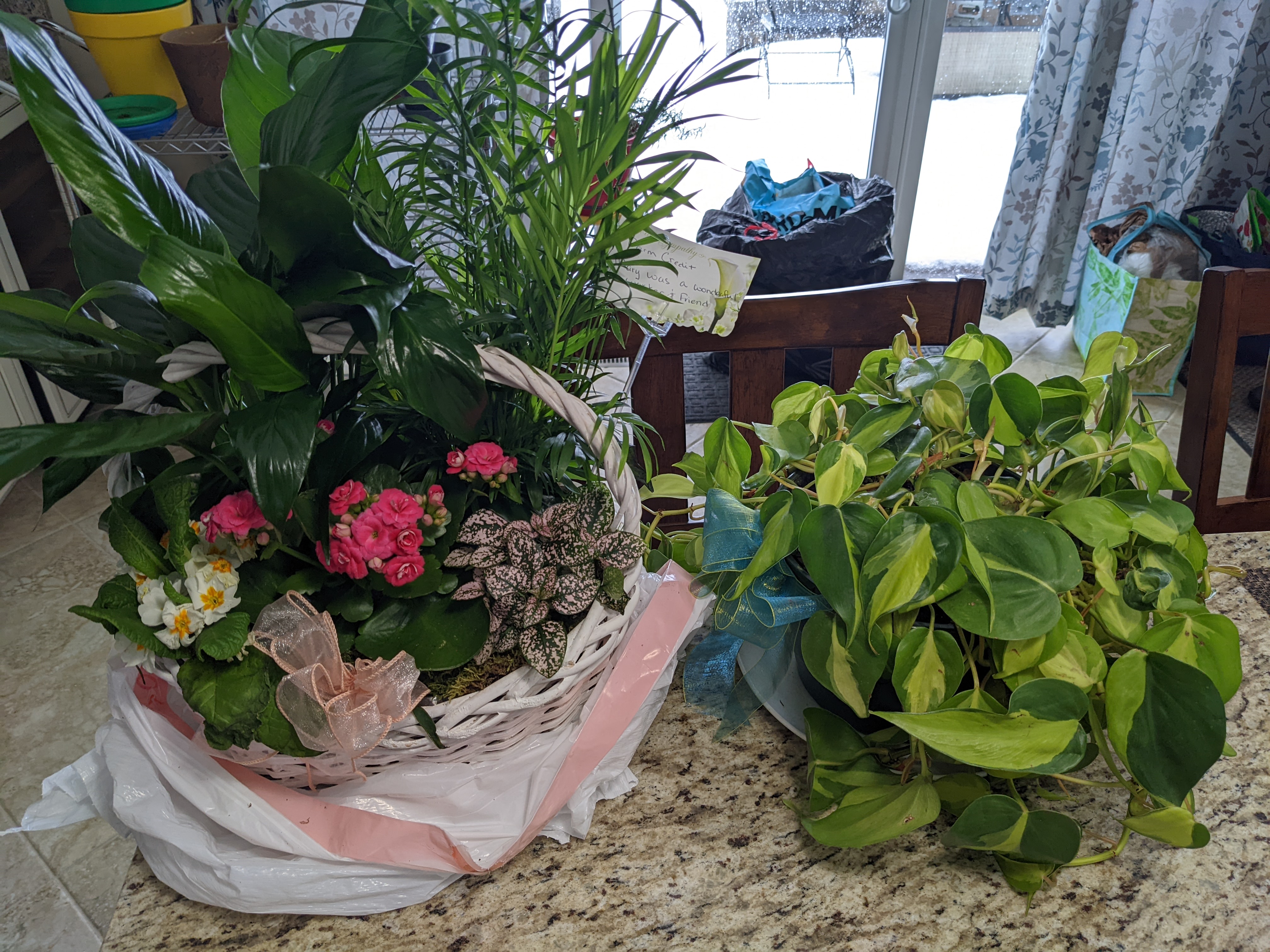 Aside from the philodendron, I’ve not much of a clue as to the identity of any of the other plants. My thing is vegetable gardening- if it’s not edible, it’s not in my wheelhouse. I did find an Android app last summer to try and correct my flora identification deficiencies. It’s called PlantNet. I ran photos of each of the plants through it and was informed that the basket includes Primrose, Flaming Katy, Polka-Dot Plant, Peace Lily and a Bamboo Palm. The app provided these identifications with widely varying percentages of accuracy.