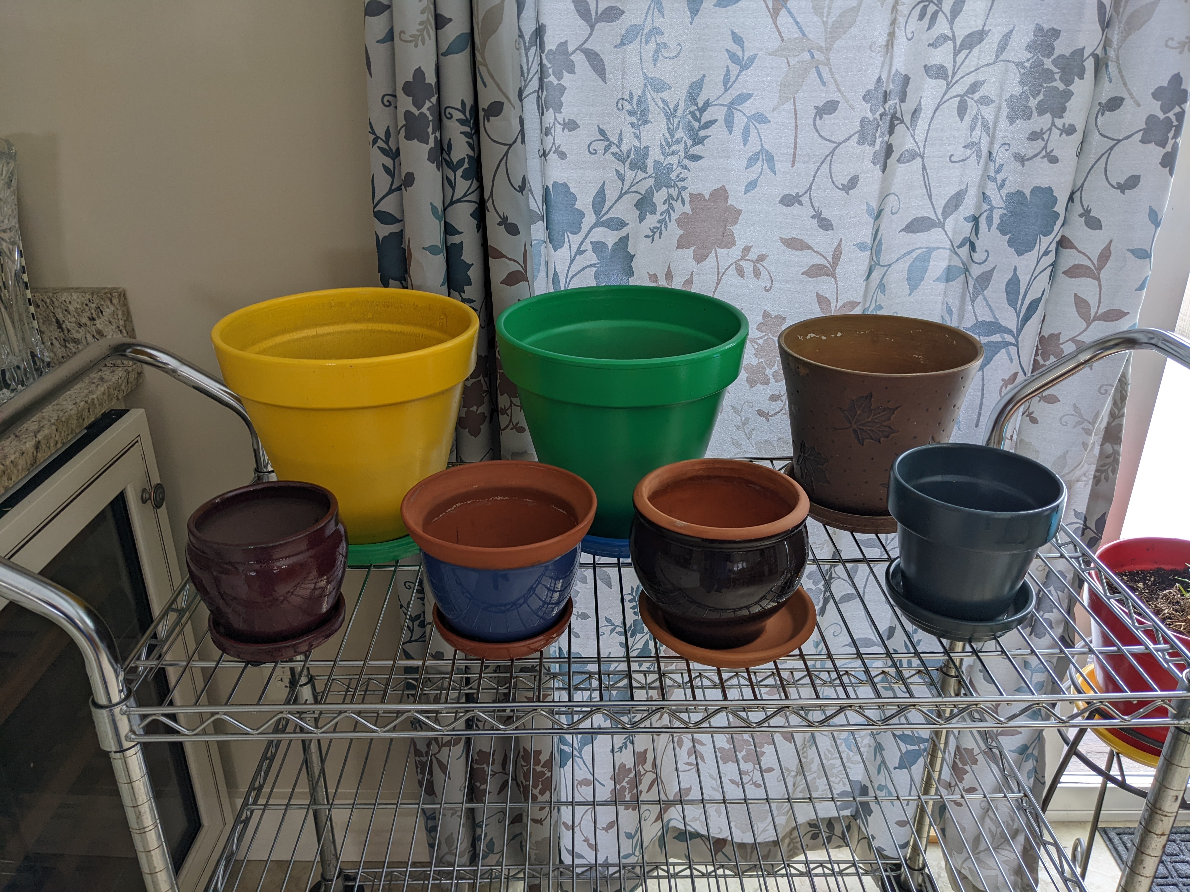 I collected all of the various planters and terracotta pots not in use, and brought them into our kitchen, which doubles as a potting shed when needed. Some of them were still a bit grungy from last year, so a bit of scrubbing was needed. They cleaned up well.