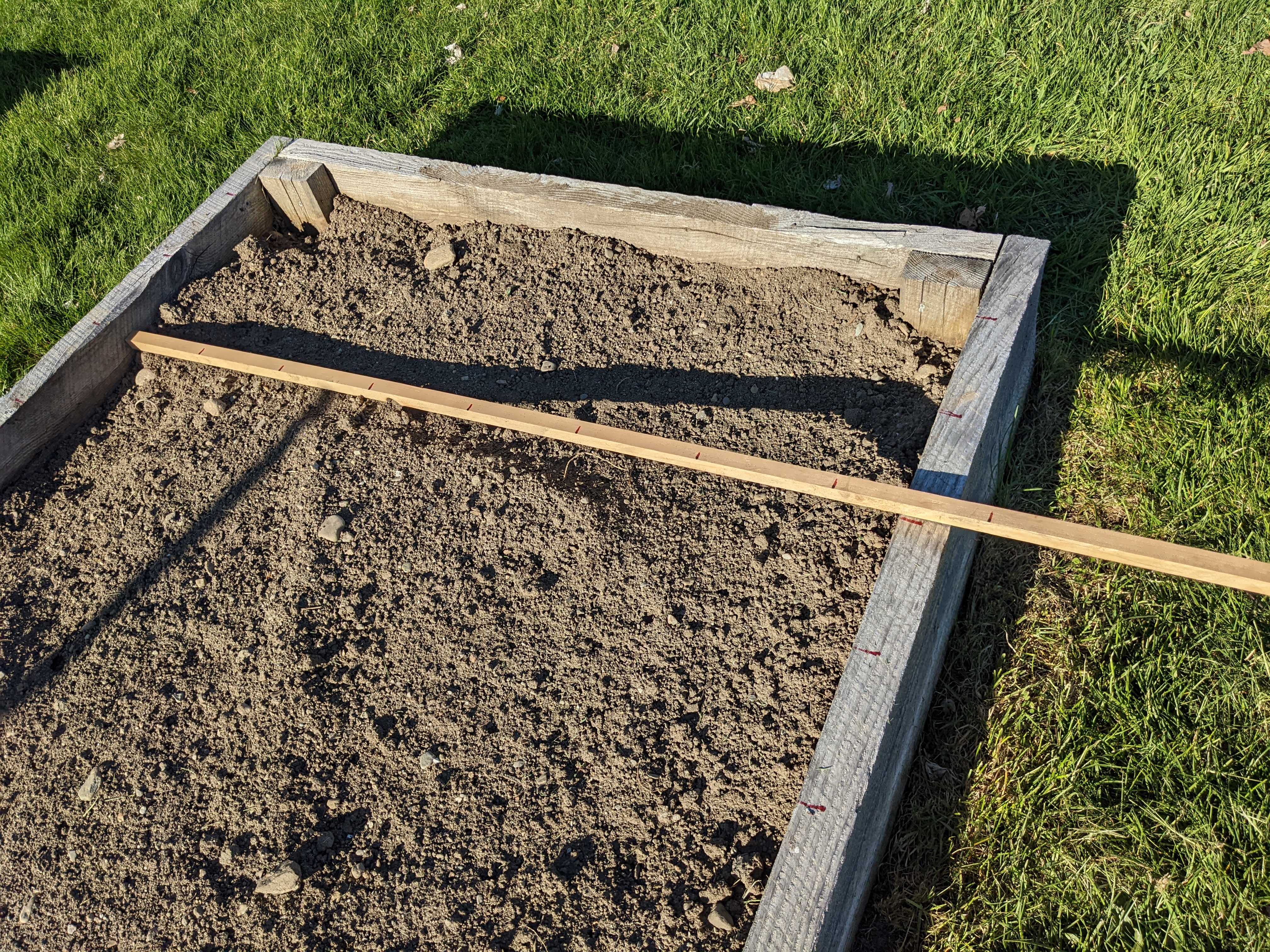 Those instructions are for traditional farming. As there are no rows in a raised bed, I’ll lay out a grid that places each plant the recommended “apart” spacing in all directions. Using guide marks on the edges of the raised bed along with my “planting stick”, each onion will be 6-8” from any other. Planting this way should yield about 100 onions per bed, as shown below.
