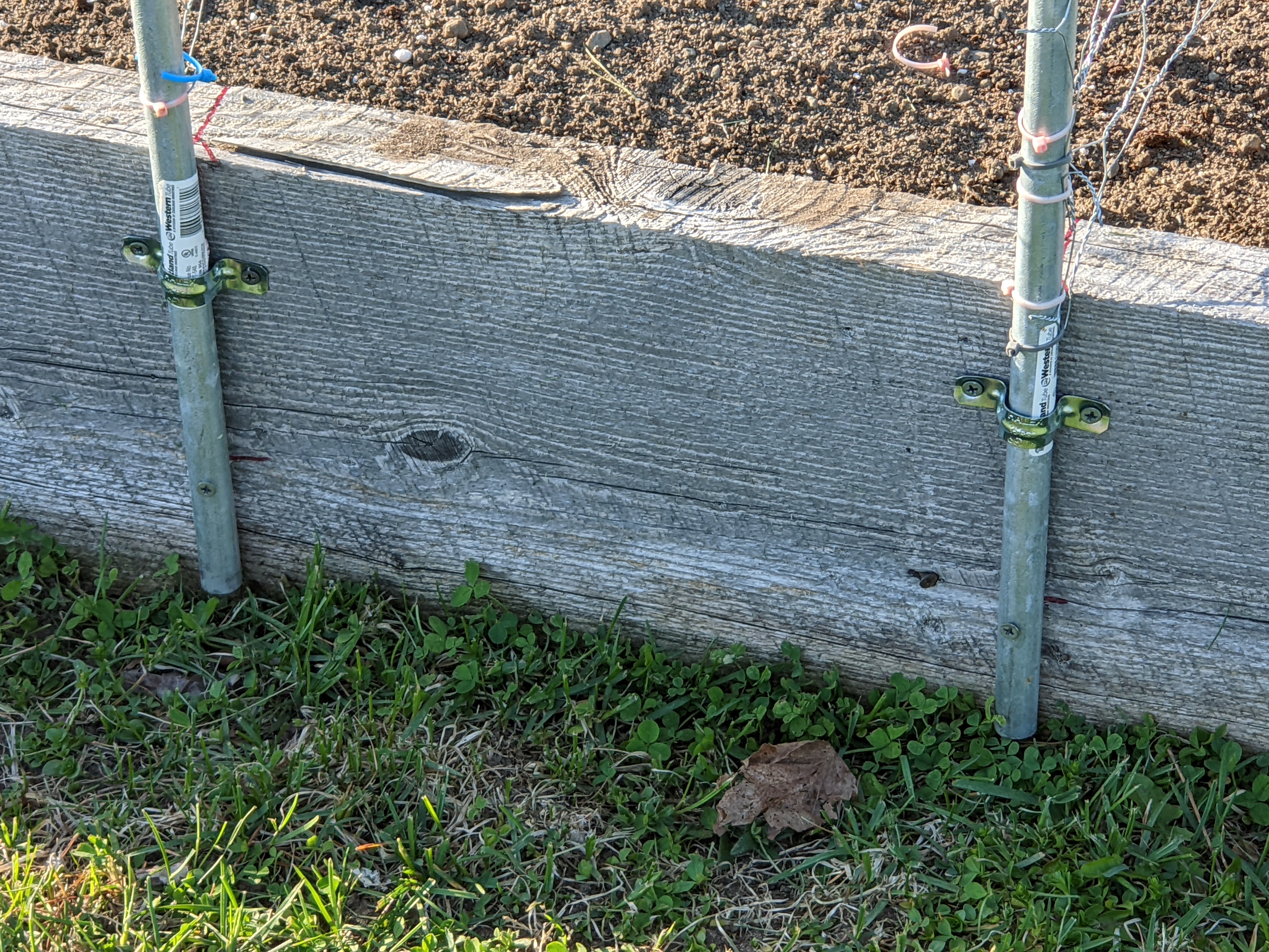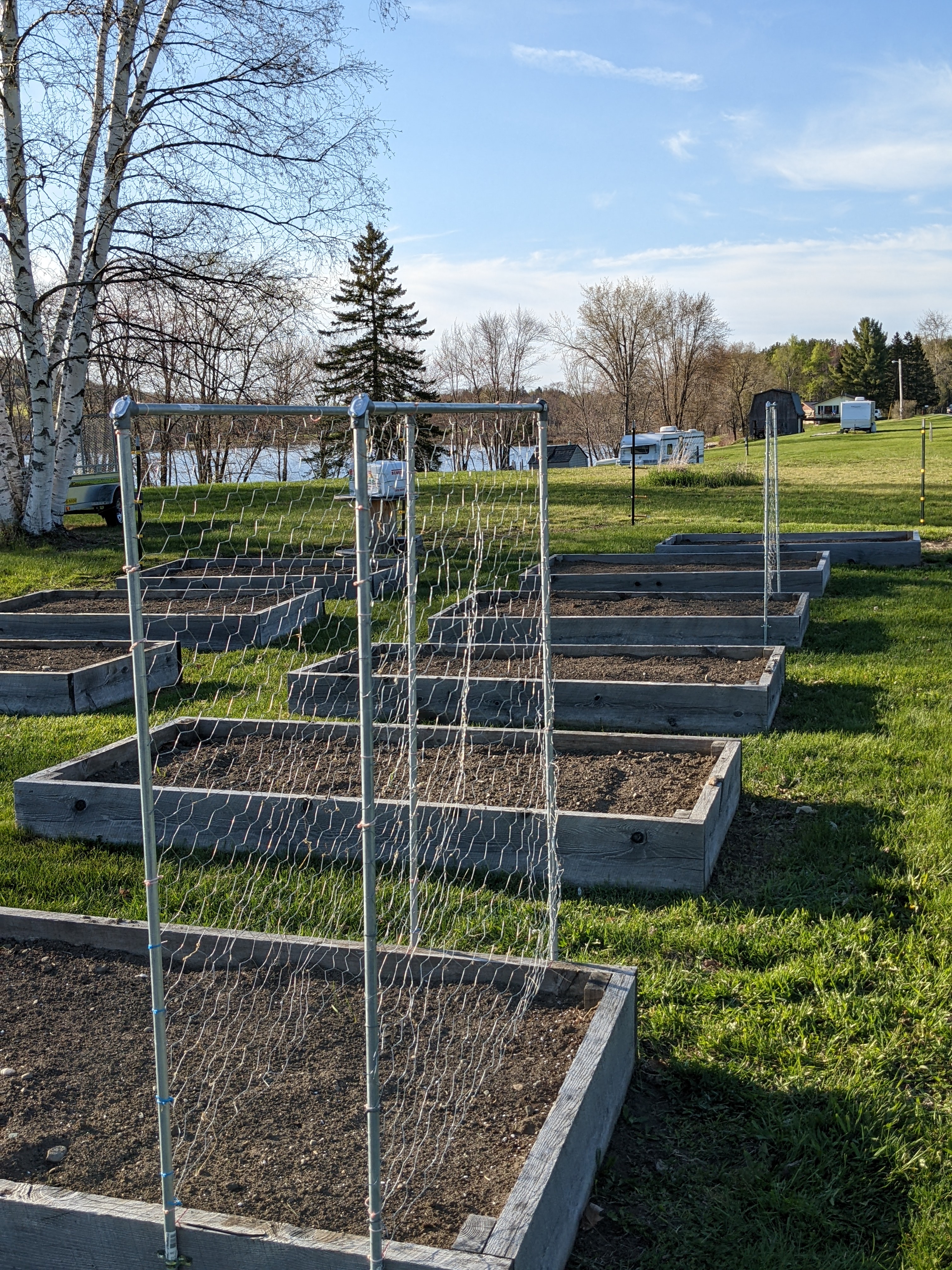 I built these a few years ago, forming the frames from ½” electrical conduit and 90°connectors. The mesh is simply chicken wire attached with plastic zip ties. The sun takes a toll on the zip ties, and each year I have to replace a few, but overall these units will last forever. Since the crops are rotated, the trellises are installed on different beds each year. The process is simple, as shown in the photo below.