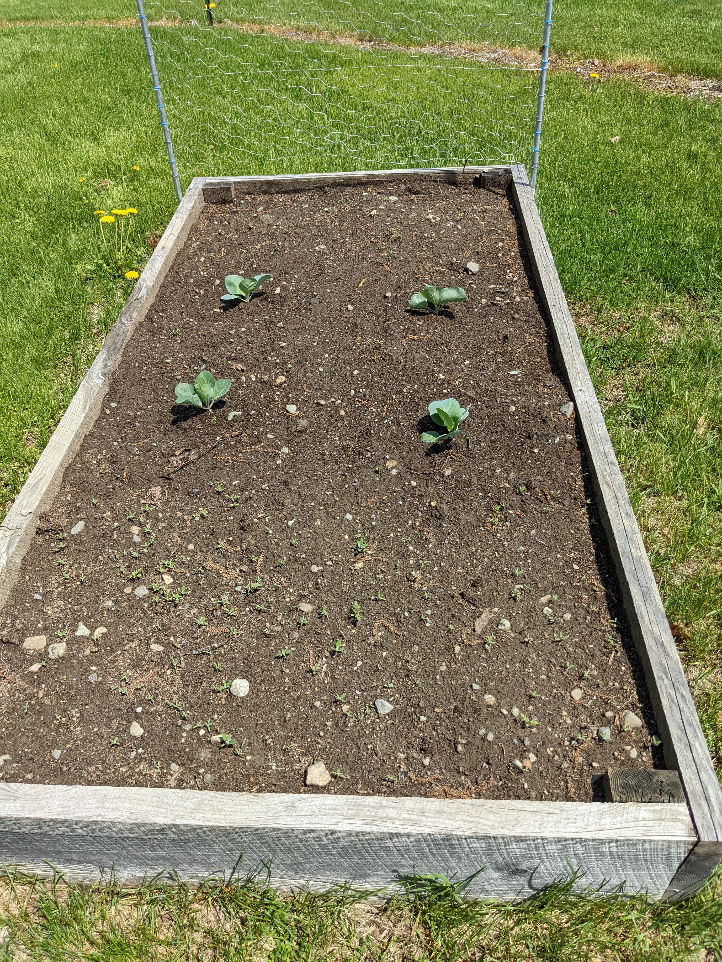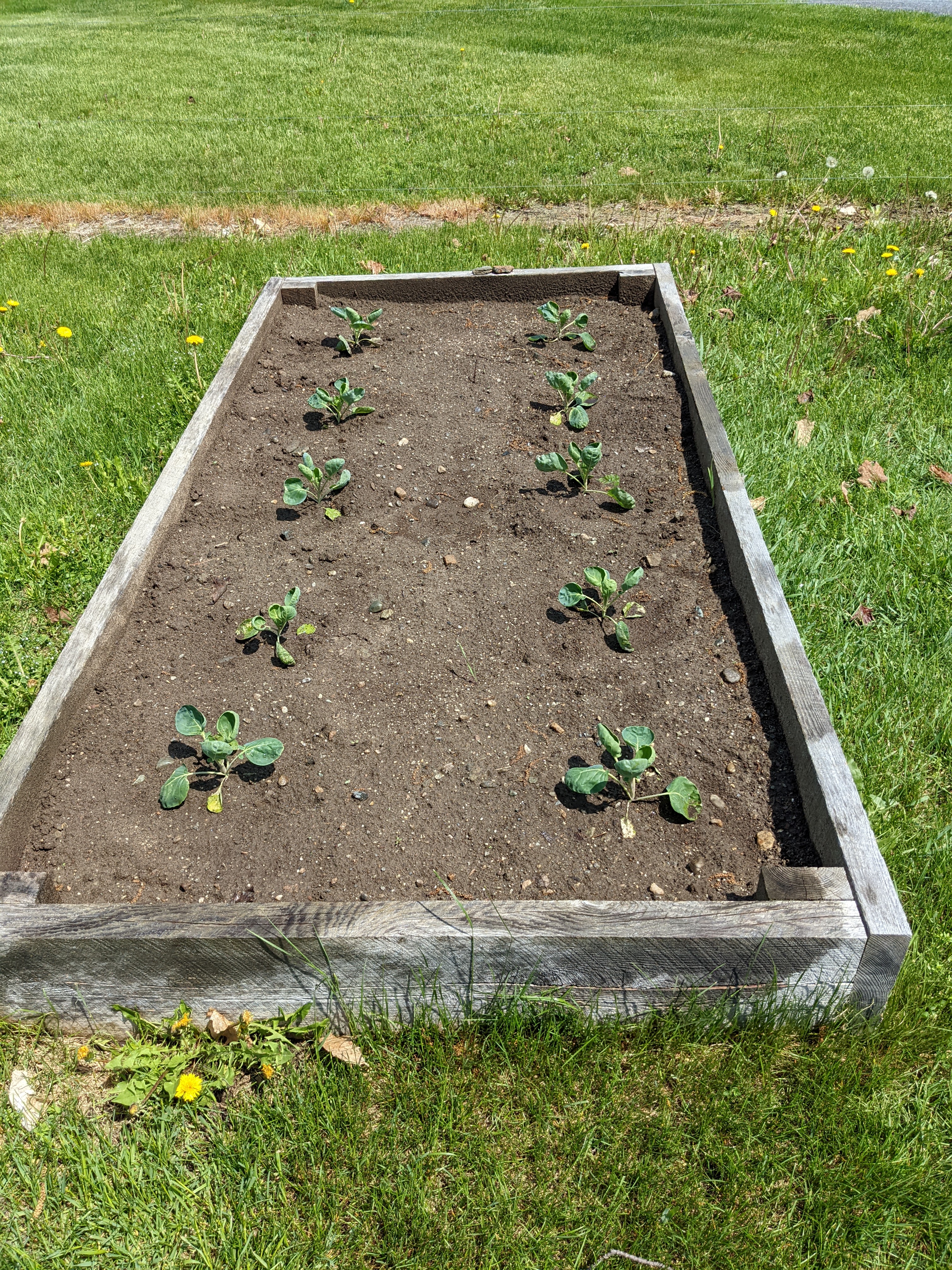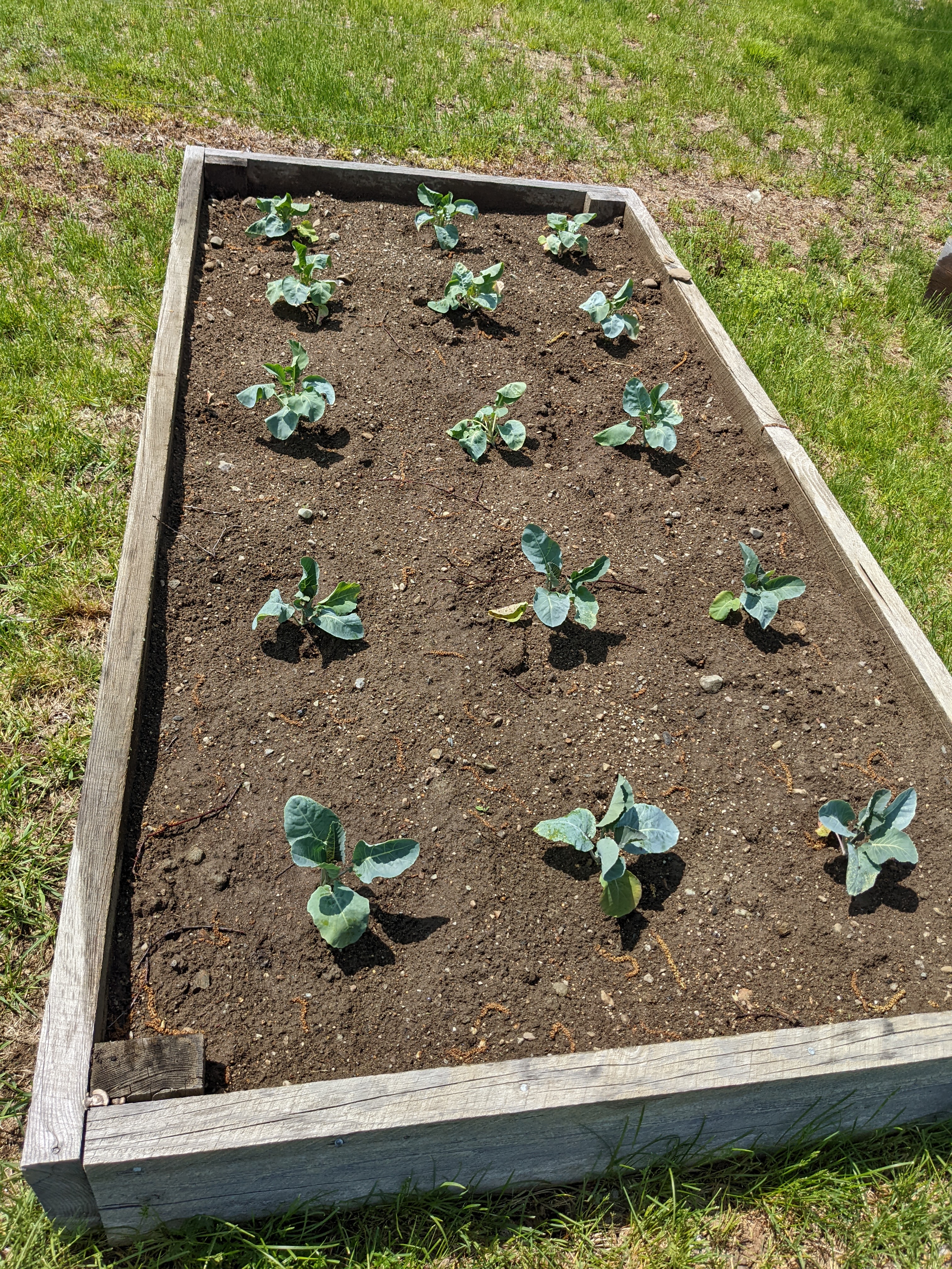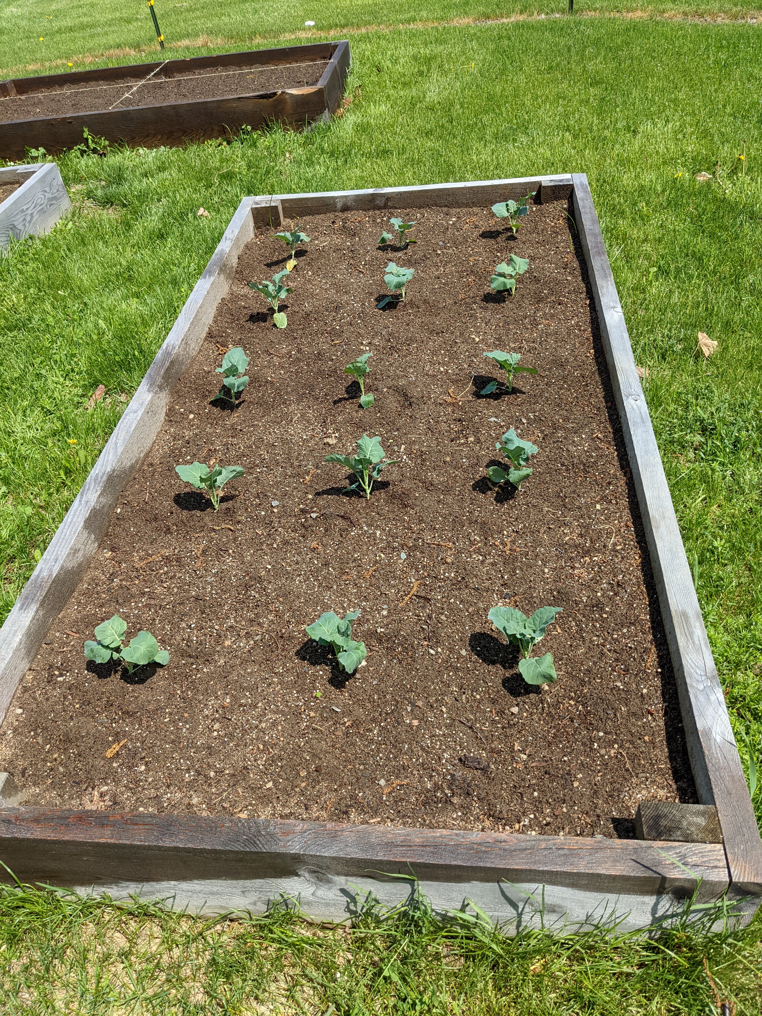 The weather for transplanting was good. It was very hot both Saturday and Sunday, in the mid-to-high 80s each day, with the promise of thunderstorms in the afternoon of each day. The seedlings were large enough and hardy enough at this point to weather T-storms without issue, as long as there was no hail. Hail would have been really bad- the stones can flatten plants.