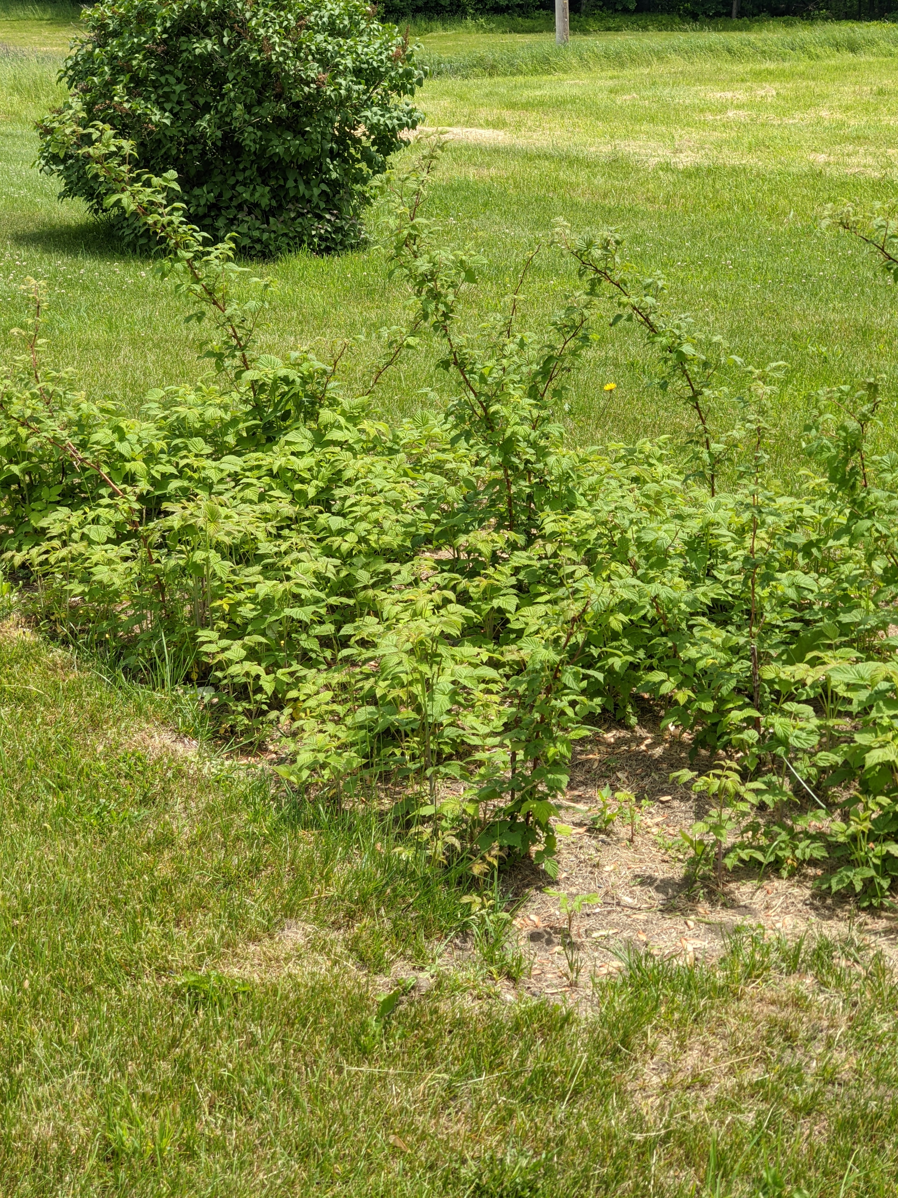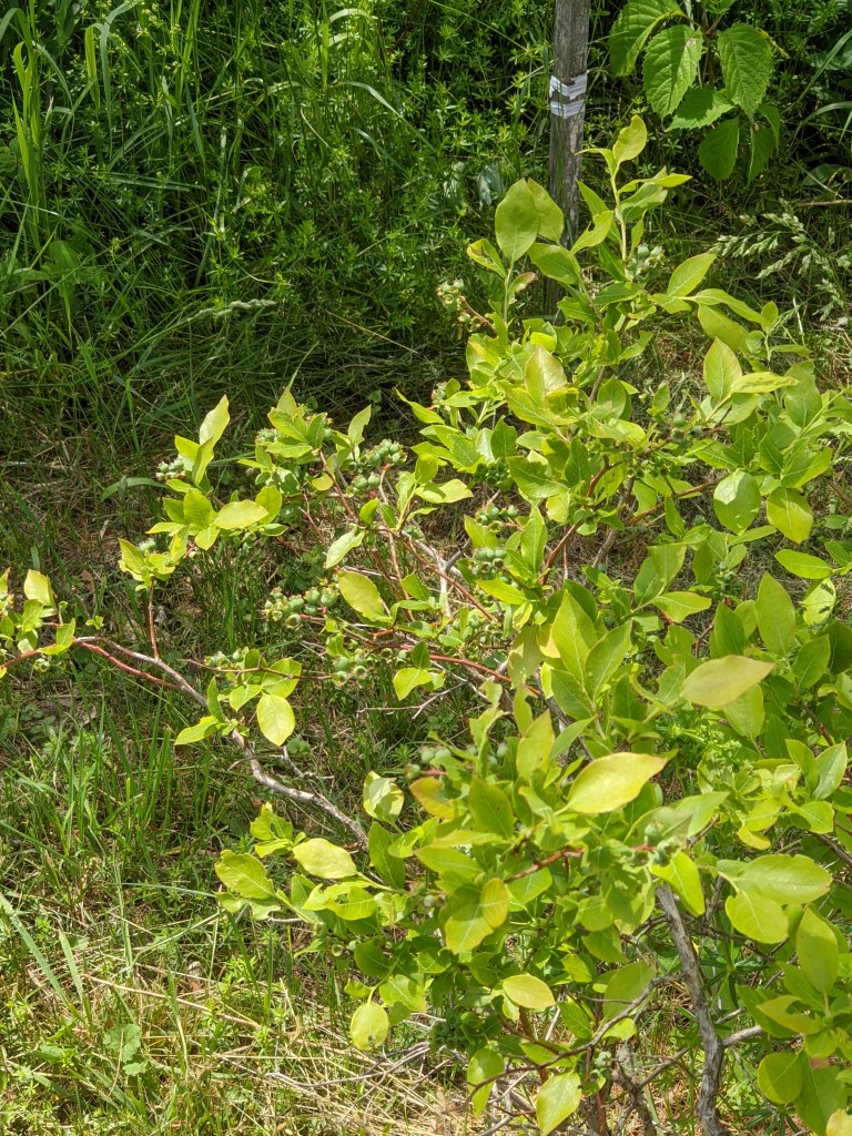 In related fruit news, on the other side of the house I discovered a nice surprise. Several of the blueberry bushes are starting to show promise of a yield this year. The raspberries also look promising. The photo below shows the little raspberry cane plot. The tall shoots should generate berries this year, while all of that lower growth will constitute next season’s production.