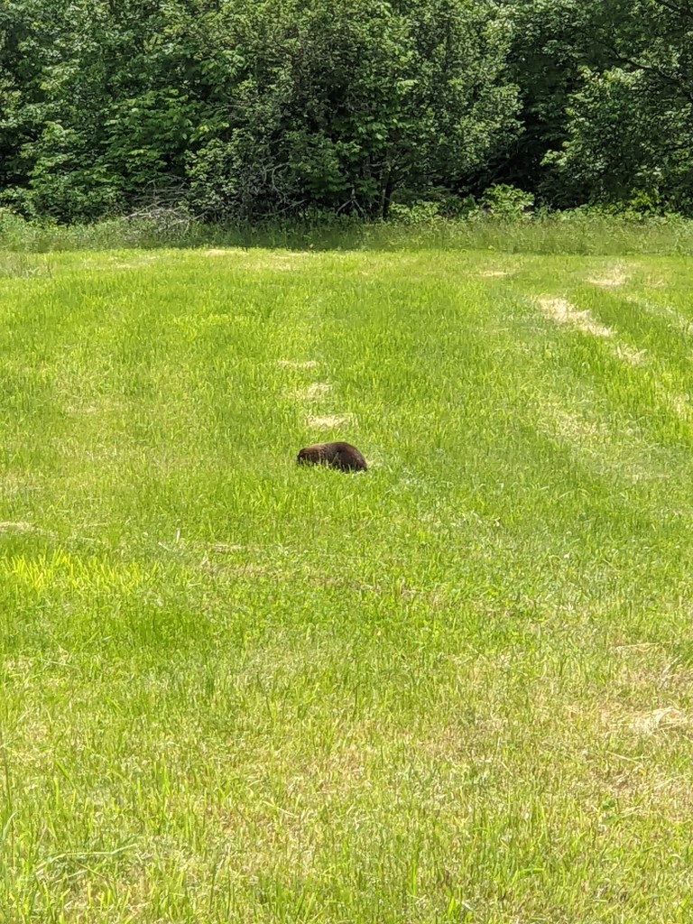Many critter sightings around the pond and neighborhood. I saw many deer out and about, and Sunday afternoon George was out in the freshly-mowed hayfield snacking. We have the resident loons teaching their new loon how to swim- I’ll try to get some photos of them soon. Of note was an eagle seen flying north that afternoon. We were alerted by the loons “emergency call”. I managed to get the photo below with the cell phone. Another eagle (or the same one?) flew by later, and was being hectored by a pair of kingbirds. I did not have the camera handy for that encounter.