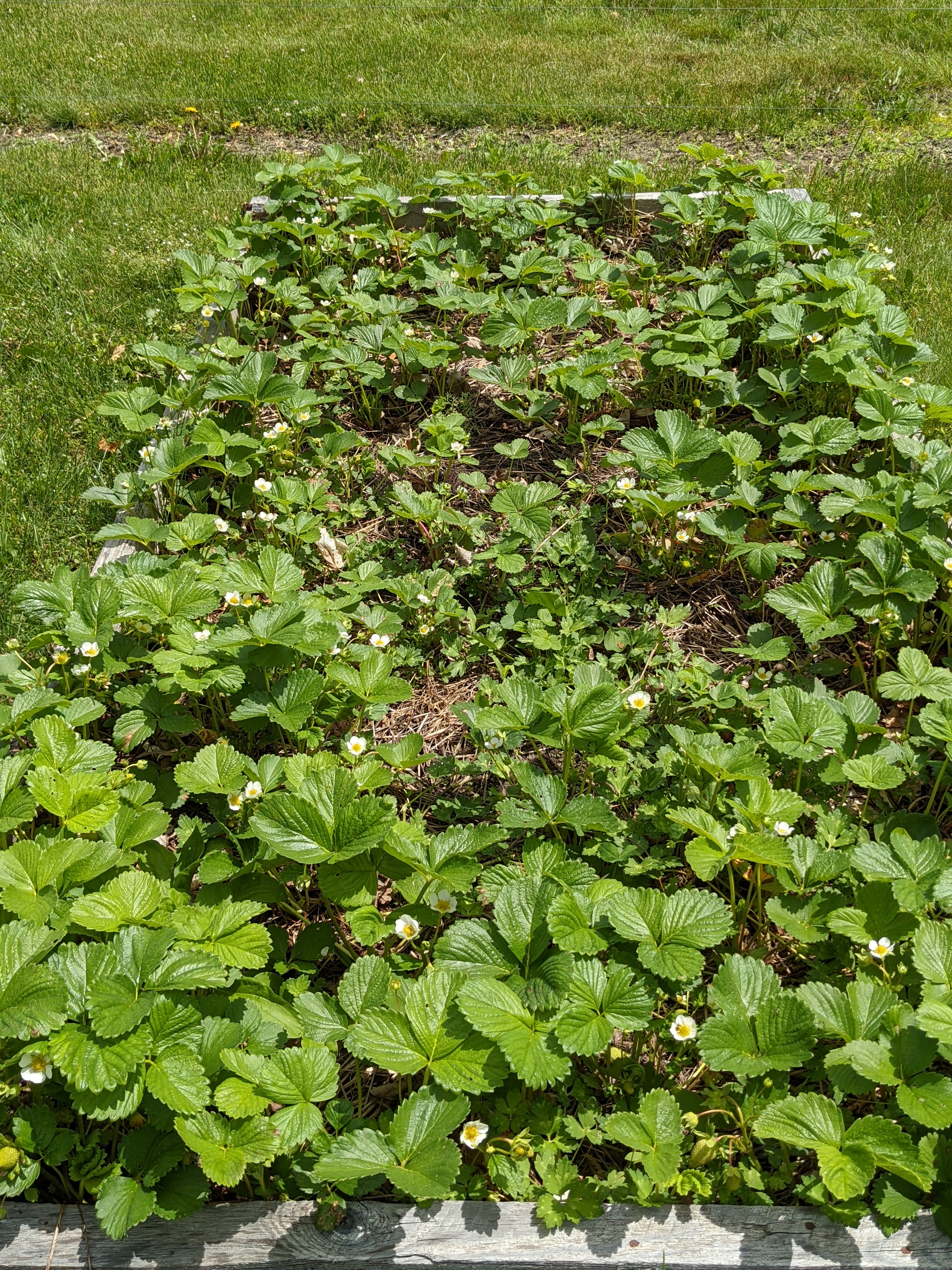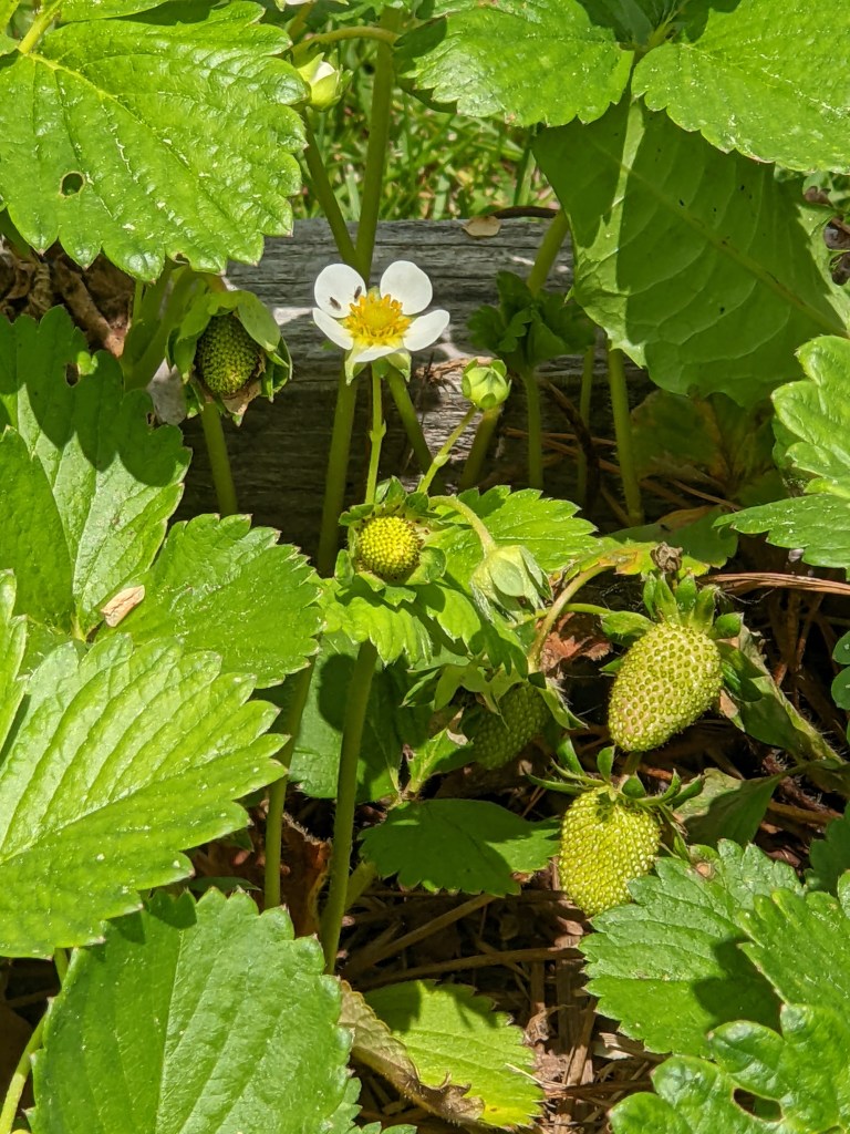 On a brighter note, the strawberry bed is becoming very green, very flowery and overall very promising. I put this bed in last year, dedicating it to everbearing strawberry plants for at least the next three or four years. Although last year the plants spent most of their energy getting established, there was some berry production and we had fresh strawberries right through September. By the looks of things right now, I think we’re in for much more this year. These are Albion Strawberry plants, sourced from FEDCO over in Maine.