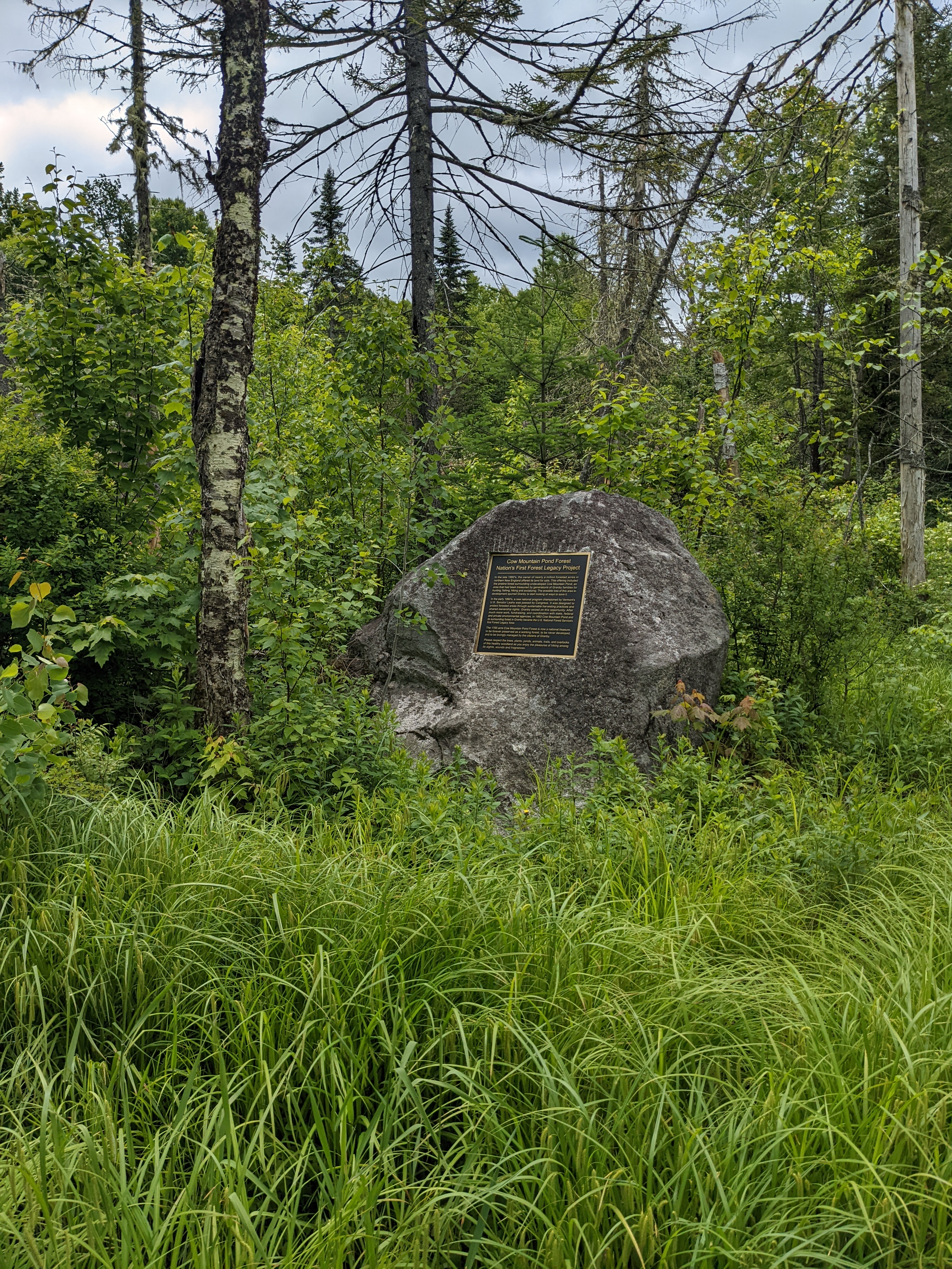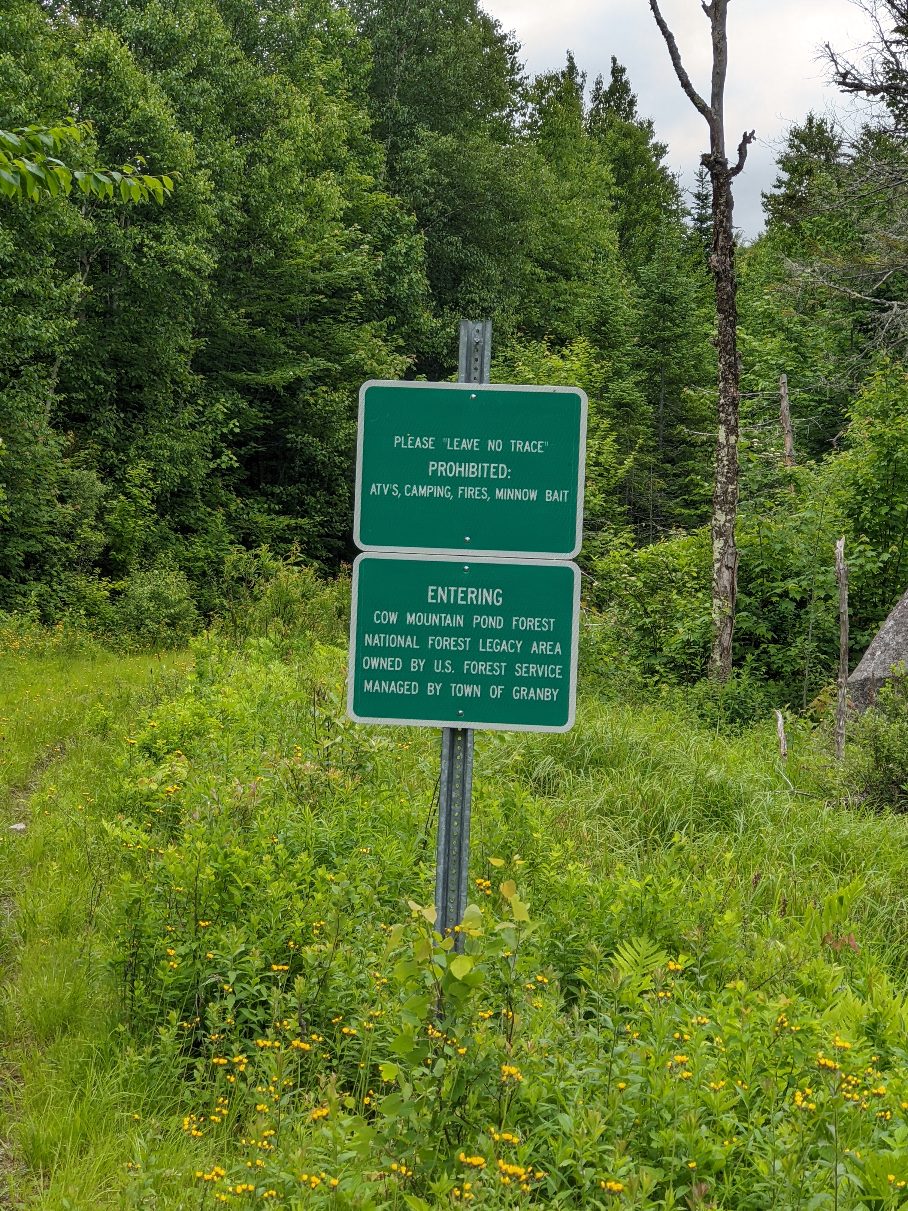 Located in Granby, VT, Cow Mountain Pond Forest is a “Forest Legacy Project” that came into being in the 1990s. It’s not a National Forest or Park. There are no facilities or staff there, and apparently it’s maintained by the town of Granby. There’s not much parking available at the trailhead, but I suspect what’s there is enough as the usage seemed fairly light.