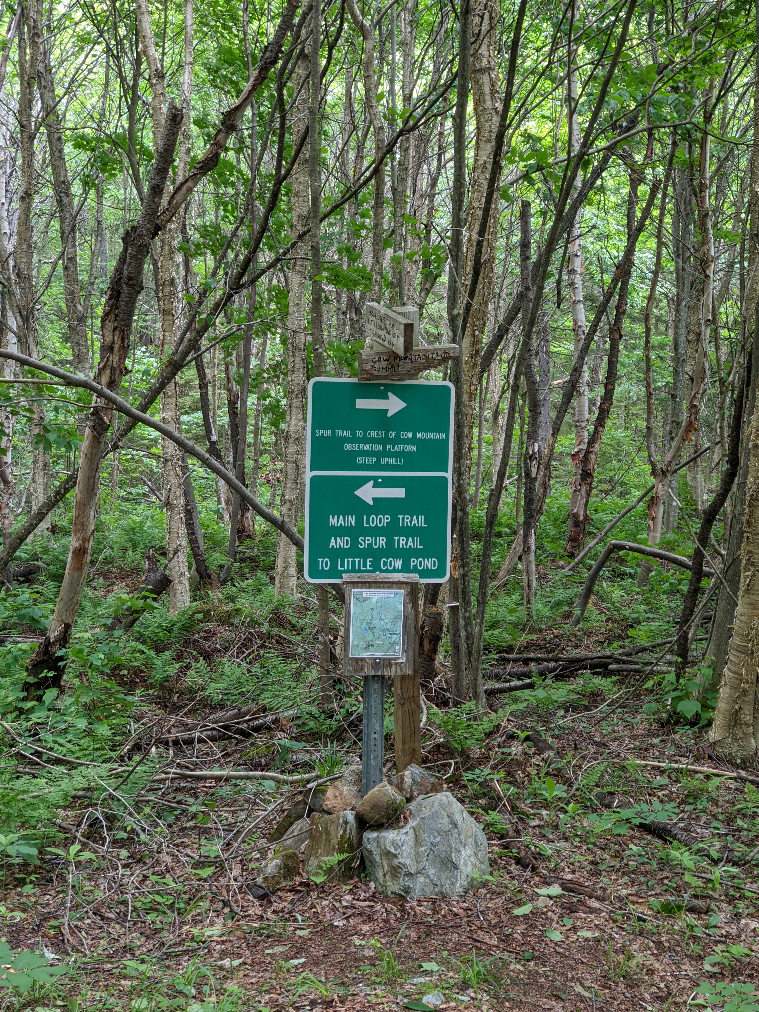 Being a spur trail, I had to back-track to the junction, and along the way encountered a family group obviously heading in to fish. Proceeding on the trail towards Cow Mountain, elevation gain was mild initially, with a couple of decent inclines along the woodland trail. All dirt, mud and low vegetation- very few rocks. After about a mile- maybe less- I reached another trail junction. The spur trail to the summit went off to the right, and to the left the other half of the loop trail back to the trailhead. Despite the warning of steepness ahead on the sign, I headed for the summit.