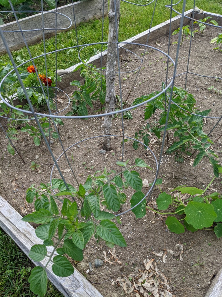 Two other crops concerned me early, the tomatoes and winter squash. I only put in a few tomato plants, as they’re strictly for eating as the fruit ripens. We do not can or freeze them. As always, the seedlings once planted immediately began looking sickly. Having been through this cycle every year, I’ve learned to just leave them alone, as they inevitably rebound. This year is no exception- the four plants now look fabulous.