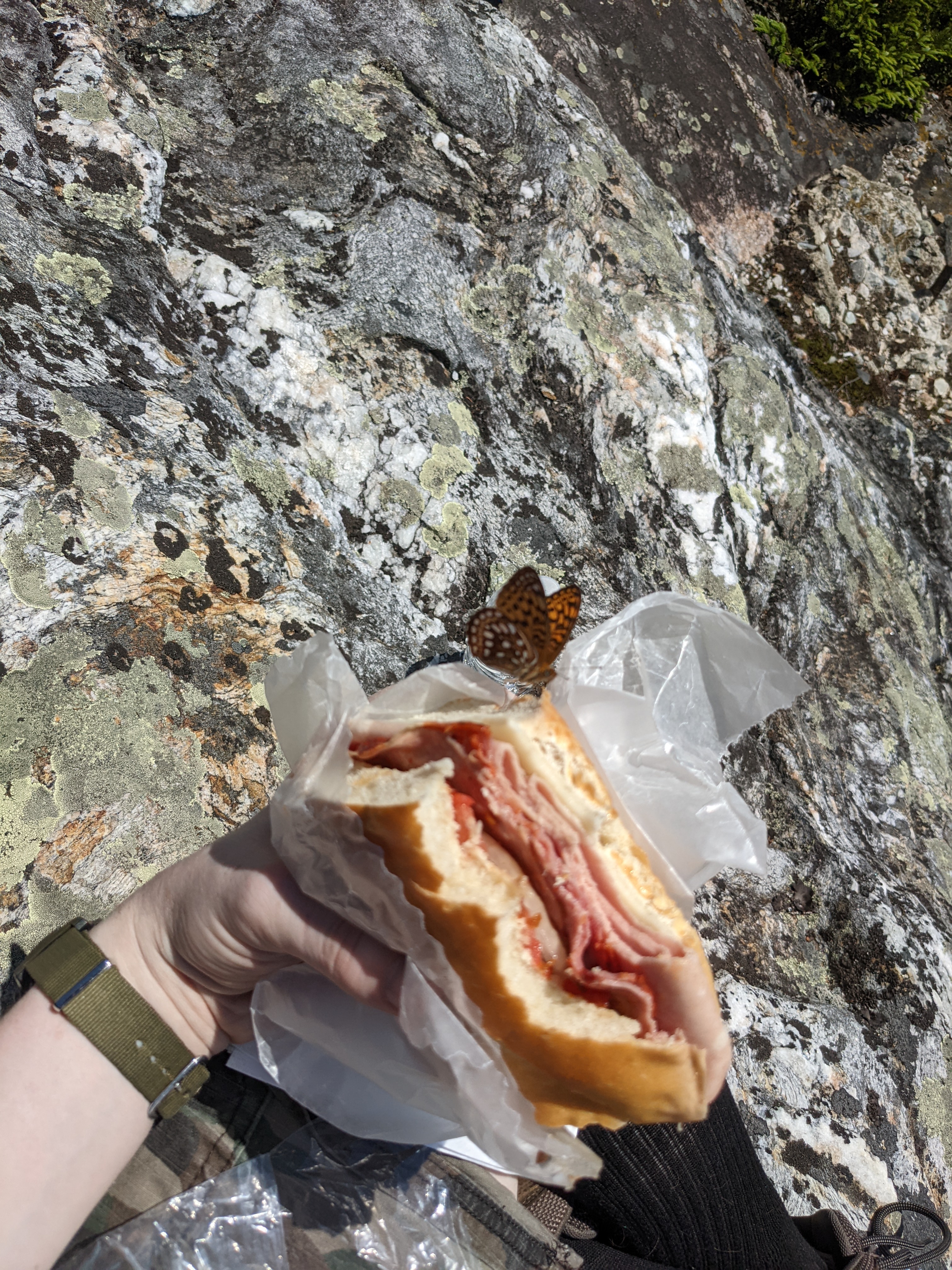 Lunch also awaited us at the summit. It was pretty warm out there in the sun, but there was a good breeze. We found a spot to sit and enjoy the Awesome Trail Sandwiches. Son found a friend and shared his.
