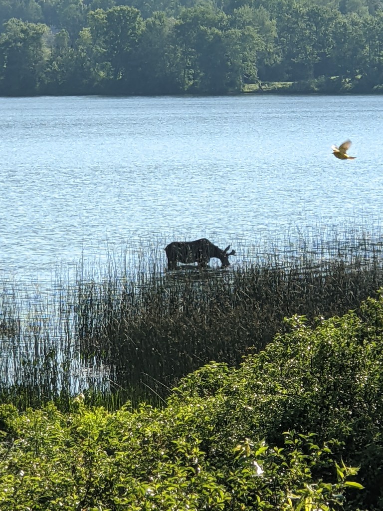 I focused in upon the brown splotch, and sure enough it was a moose! This is the first moose I’ve seen on the pond, or in Vermont for that matter. I’ve seen dozens in Maine. I grabbed the phone- this is the best photo I could get: