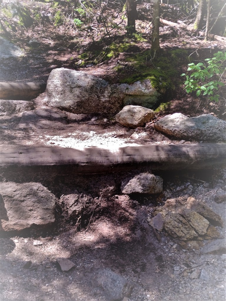 Son and I also noted and commented upon the lack of markings on this trail. We saw no blazes of any color during the entire hike. To be fair, the trail is unmistakable, so it’s not a big deal. But we did see one marking we liked- an encouragement to “Keep Going” emblazoned on a log step. It’s hard to see in the photo, but it’s there. At this point you’re perhaps a mile up the trail.