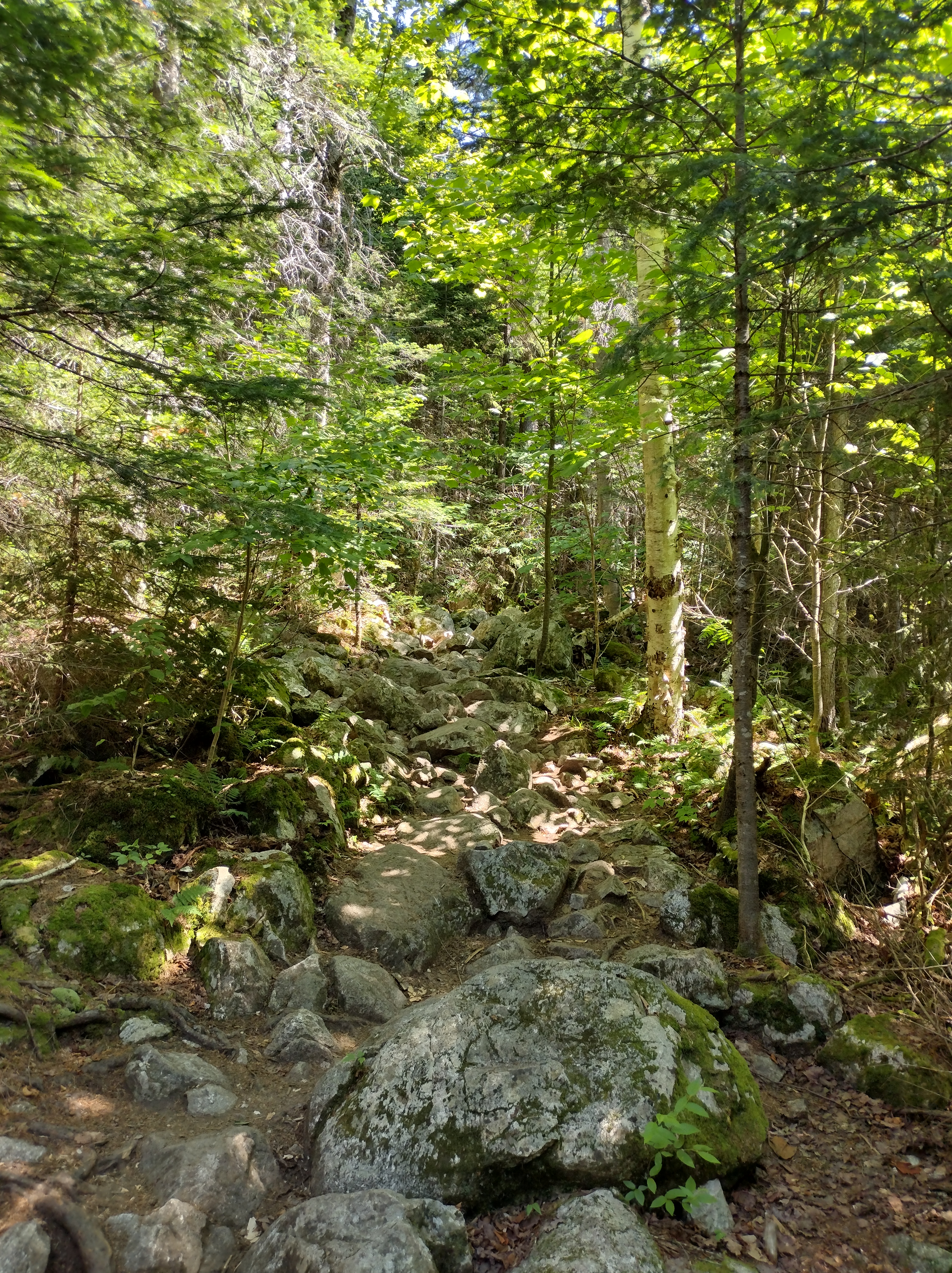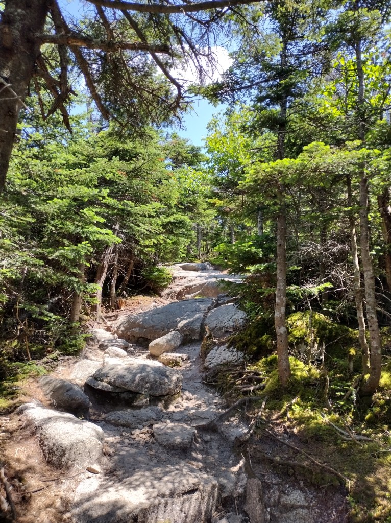 The Summit Trail is managed by the National Forest Service, as it’s in the White Mountain National Forest. There is a small parking lot at the trailhead, but by the time we got there it was full and the overflow traffic was lining an appreciable length of Tripoli Road. This is obviously a popular hike, as are most these days in the Whites. We joined the overflow and parked the Jeep about ¼ mile from the start of the trail. We hydrated, loaded up the daypacks and headed onto the path upwards.