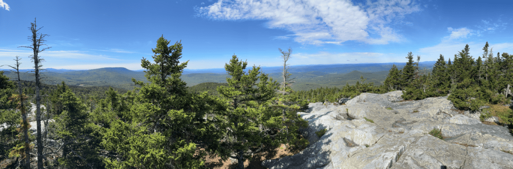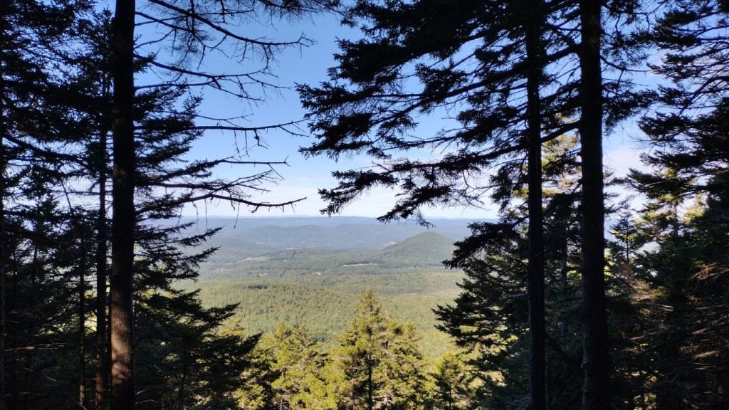 After enjoying the vistas to the west, we continued along the trail, once again heading down across the col towards the summit of Mt. Cube to the northeast. This part of the trail was muddy in spots, but completely passable. It wasn’t long before we cleared the trees and clambered up and over the rock face to the summit. Here the Cross Rivendell junctions with the Appalachian Trail.