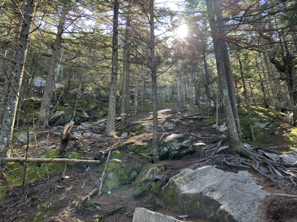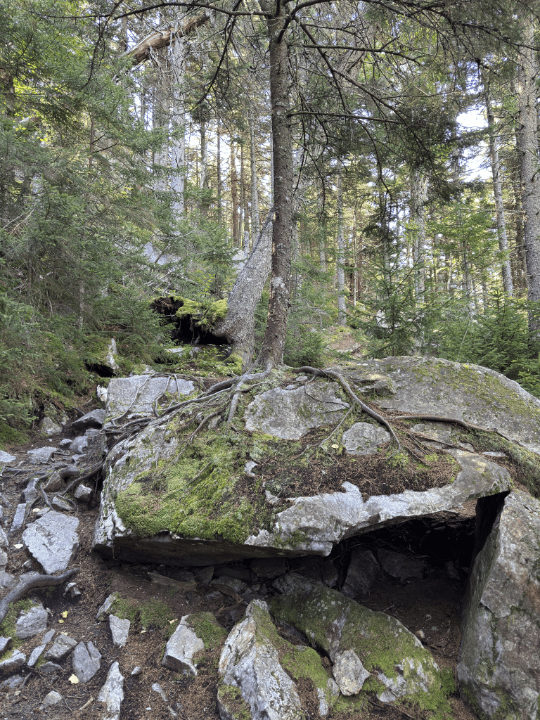 As we gained elevation the rock became more prevalent, and it’s not granite we’re used to seeing in the White Mountains. It’s more quartzite than anything else, and some of the larger crystalline outcroppings we walked across as we came upon the first overlook were interesting.
