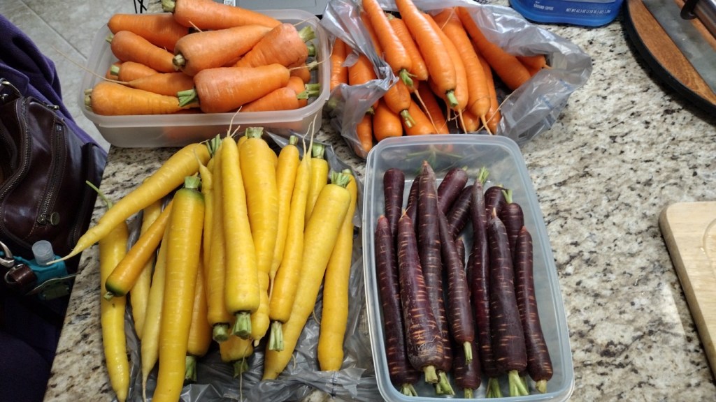 Four varieties of carrots meant four buckets and trips to the kitchen. Once they were all inside, it was time for chopping. Wife was still a-scrubbing when I took up the knife and began hacking away at the veggies. We held out several pounds of each variety to have some fresh ones in the fridge, and to pass along to other folks.
