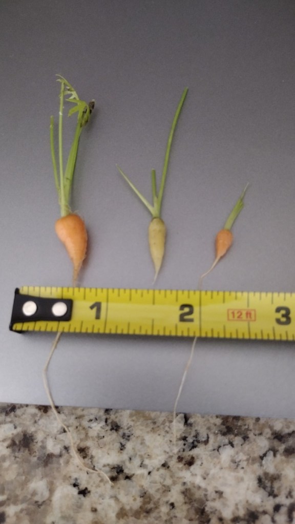 As each type filled their respective bucket, I brought them into the kitchen where Wife was busily scrubbing away. Then I’d take the load of carrot leaves and smaller discards to the compost heap, and go pull up the next variety. Several of the tiniest carrots managed to avoid detection until this cleaning phase: