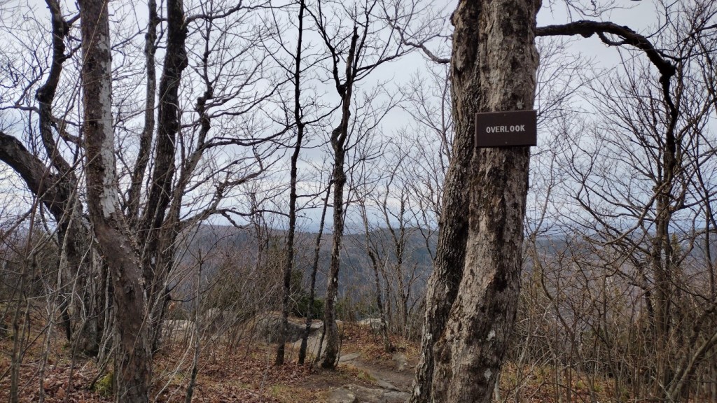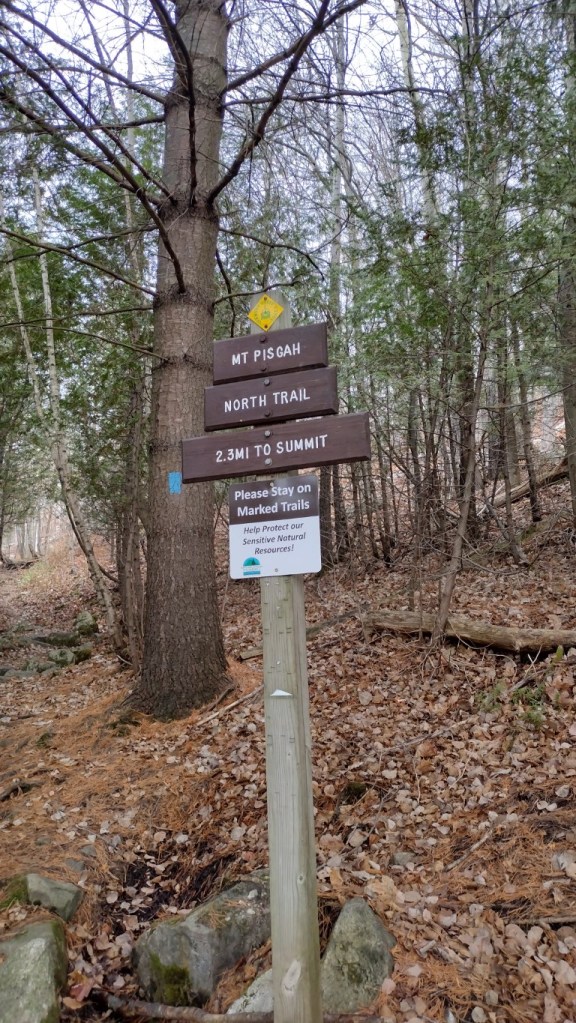 On Mt. Pisgah the cliffs are the thing. The summit has no view, and in fact isn’t even marked as such. There’s a sign at the junction of the South and North Trails, with an elevated spot behind it which seems to be the highest point on the trail. As such, I declared it the summit.