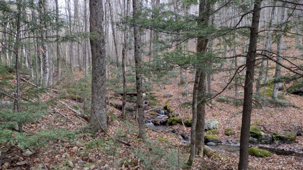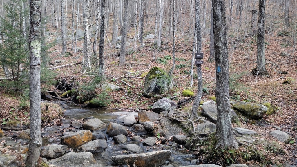 Initially this trail is rather gentle, in my opinion. The inclines are easy as it runs along the ridge approaching the mountain, crossing a couple of streams. The trail is wide and well marked, and shows signs of getting a lot of use. This is one of the more heavily accessed mountains in the area and usually the parking area on the side of Rt, 5A is quite full. Not today- so far I had the hill to myself.