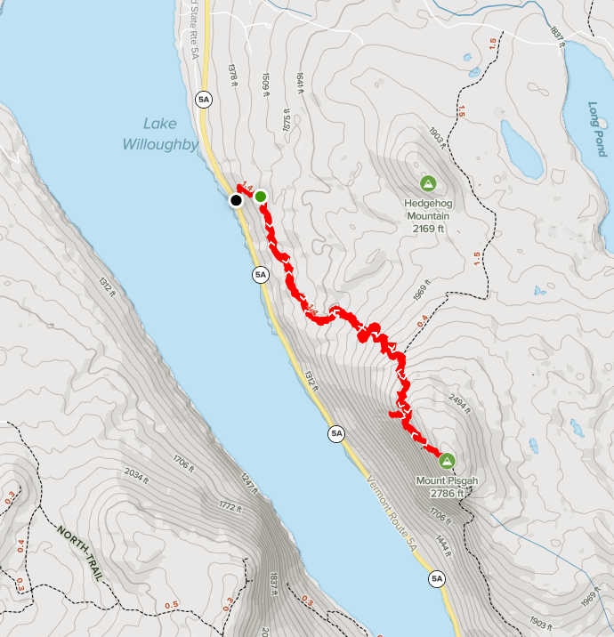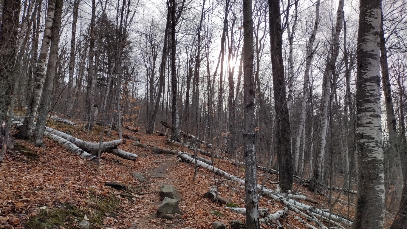 Mt. Pisgah rises sharply from the eastern shore of Lake Willoughby down in Westmore, about 10 miles from the house. I decided to head up the North Trail, which departs from the side of Rt. 5A. That Friday was rather overcast, but dry and not too cold. I arrived at the trailhead mid-morning and headed up the hill.