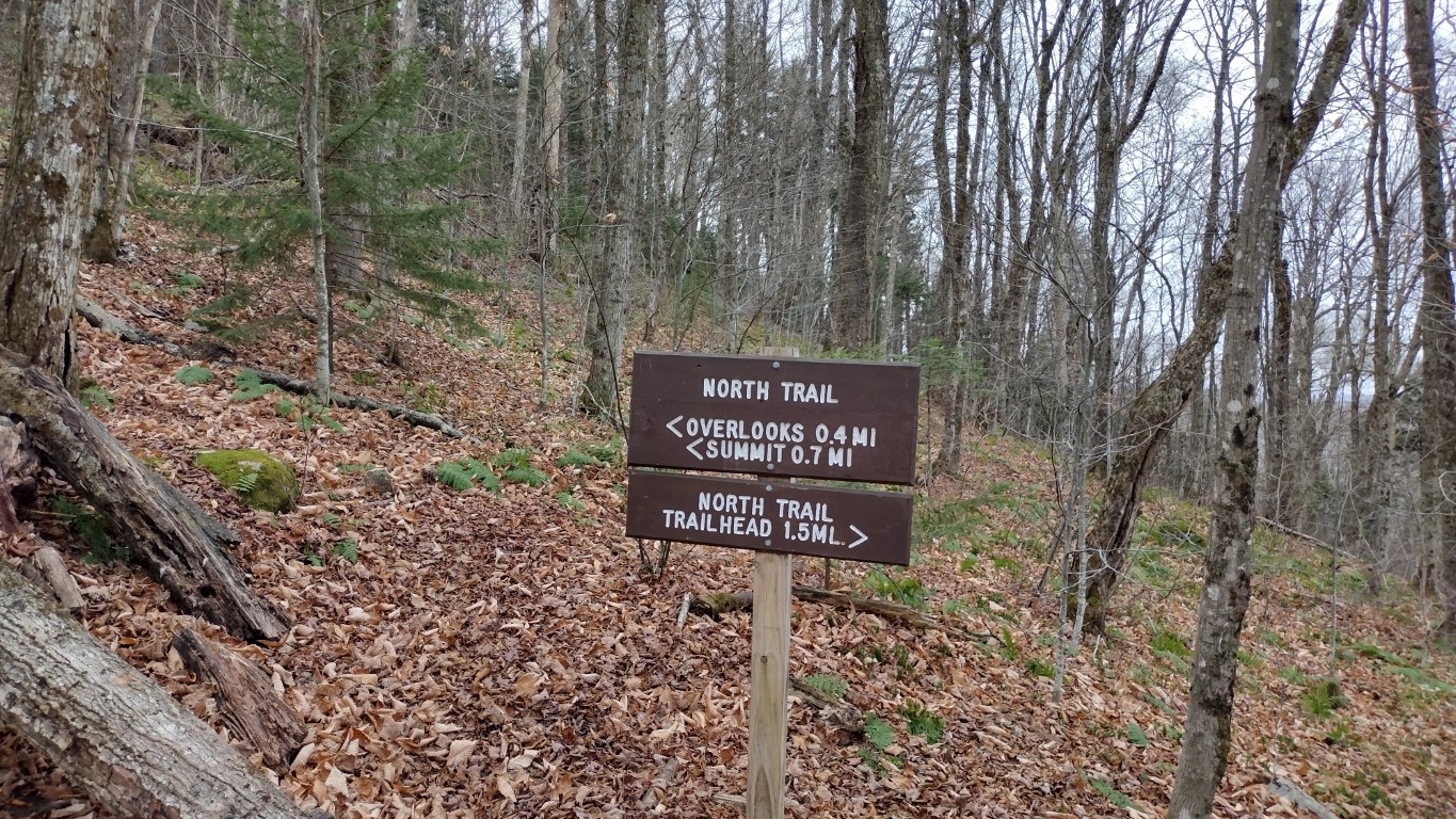 On Mt. Pisgah the cliffs are the thing. The summit has no view, and in fact isn’t even marked as such. There’s a sign at the junction of the South and North Trails, with an elevated spot behind it which seems to be the highest point on the trail. As such, I declared it the summit.