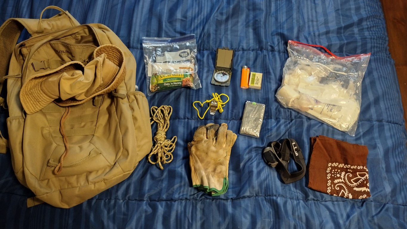 For all excursions, I carry a few snack/ energy bars along with a sandwich for lunch; my compass along with a paper map if needed; fire starters and a bag of basic first aid gear. Nothing too fancy there, just enough to stop the bleeding or wrap up a sprain.