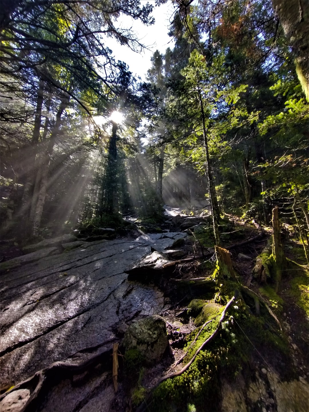 What I consider the best photo from the trails this year is below, taken while we were hiking up a dark and dank Champney Falls Trail last August, heading for the summit of Mt. Chocorua. It was our first real look at the sun that day as it crested the ridge.