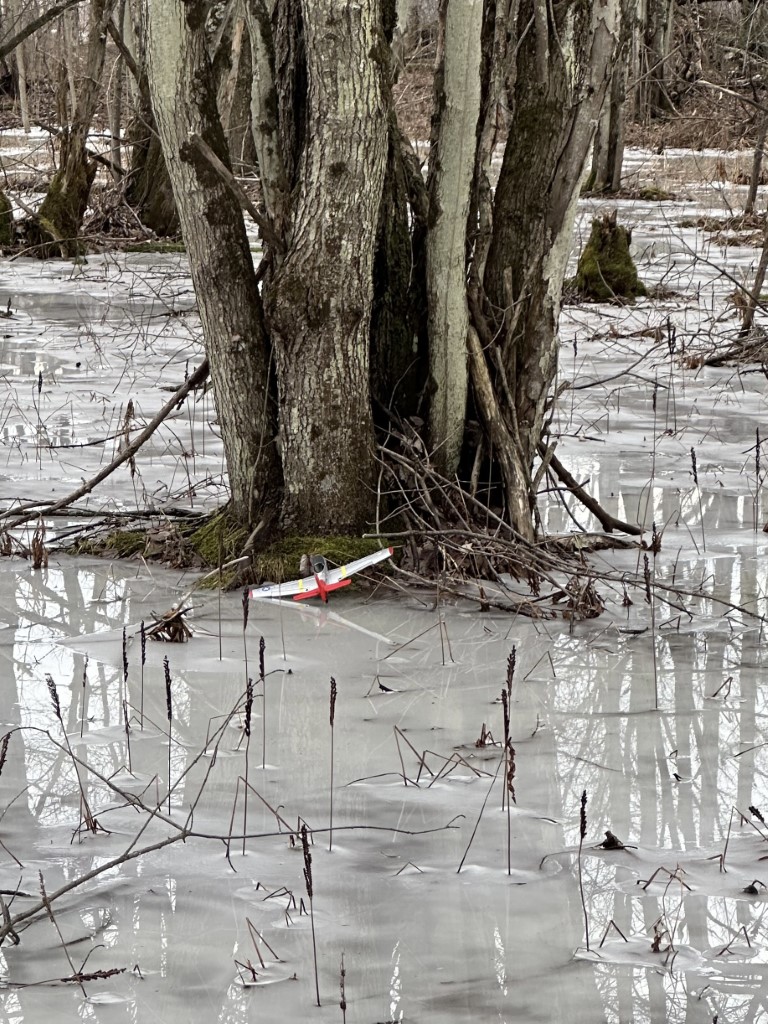 Making a mental note of the line the plane took into the woods, down the road we walked to see if it could be recovered. Fortunately the snow here is mostly gone, and getting through the woods wasn’t hard. We went in twenty yards or so and came upon a frozen bog on the side of the pond, and Son spotted the plane at the base of a tree.