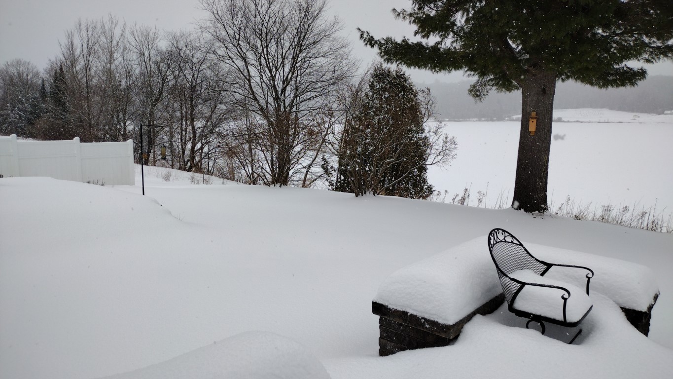 in the North Country. I just came in from the first pass clearing off the driveway, and since the snow is still coming down- much more lightly now- it’s a good bet I’ll be out there again for another pass. About 6 or 7 inches has come down so far.