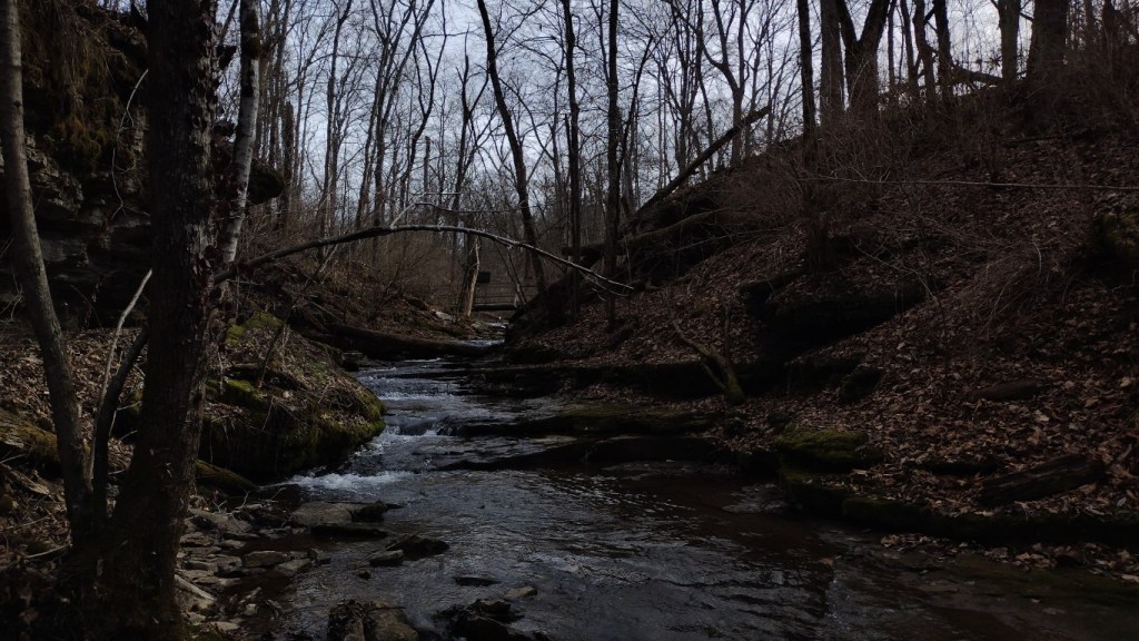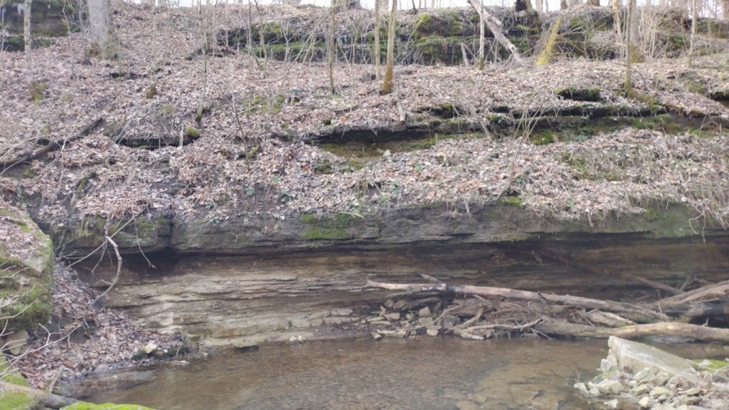The Jessamine Creek Gorge Trail heads directly to the gorge, then crosses it and proceeds up a ridge where you can glimpse the Kentucky River and the sandstone cliffs on the other side through the trees. I don’t think there are any views once the trees leaf out. A man I met on the trail told me that there are a couple of bushwacks off the trail, one to the falls where Jessamine Creek falls into the Kentucky, and another at the outbound end of the trail that leads down the rock cliffs to the Kentucky River. Unfortunately, I didn’t have the time for either of these, as Wife was patiently waiting for me at the trailhead. Here are a few photos of the trail: