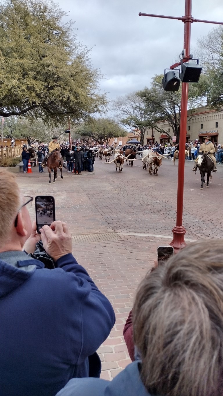 As the sun descended to the horizon, a chilly day had become downright cold, and the wind had increased. Wife and I popped into the Cowboy Network Bar for a beverage while we awaited the 4PM Walking of the Longhorns. It’s not like the running of the bulls in Pamplona. Here, a few cowboys and cowgirls slowly lead a herd of 16 longhorns through the streets, everyday at 11:30AM and 4PM. Everyone watches them mosey past, and then it’s back into the stores, bars and restaurants.