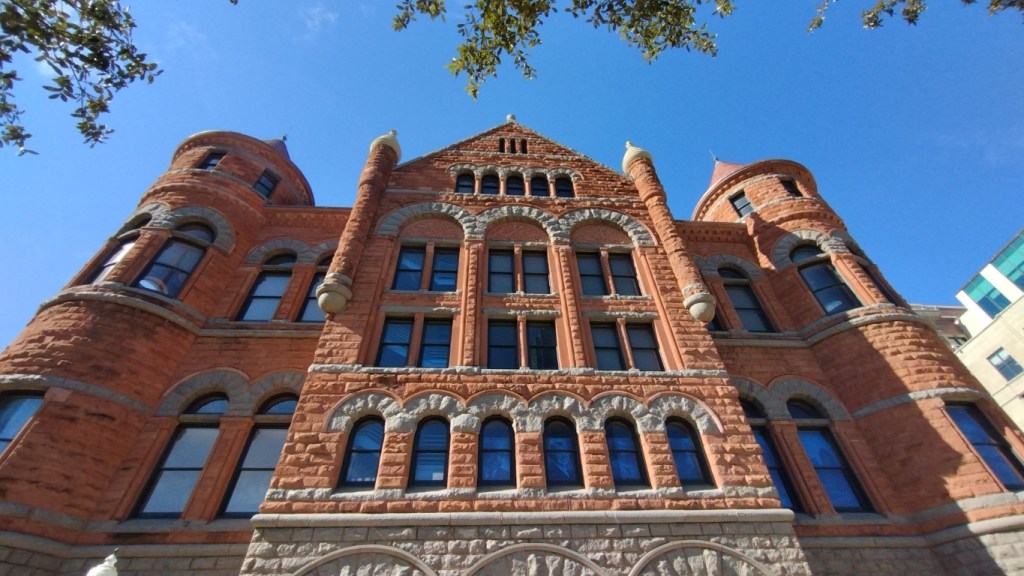 We descended several levels in the garage before finding a space. Fortunately there were elevators, which we took back up to the street level. As we got out of the elevator we saw in front of us the Old Red Courthouse. This was the courthouse for Dallas County from when it was built in 1892 until 1966. The building was vacant for many years until it was renovated and became the Dallas County Museum. The building was renovated about 15 years ago, but it is closed now, permanently, I think.