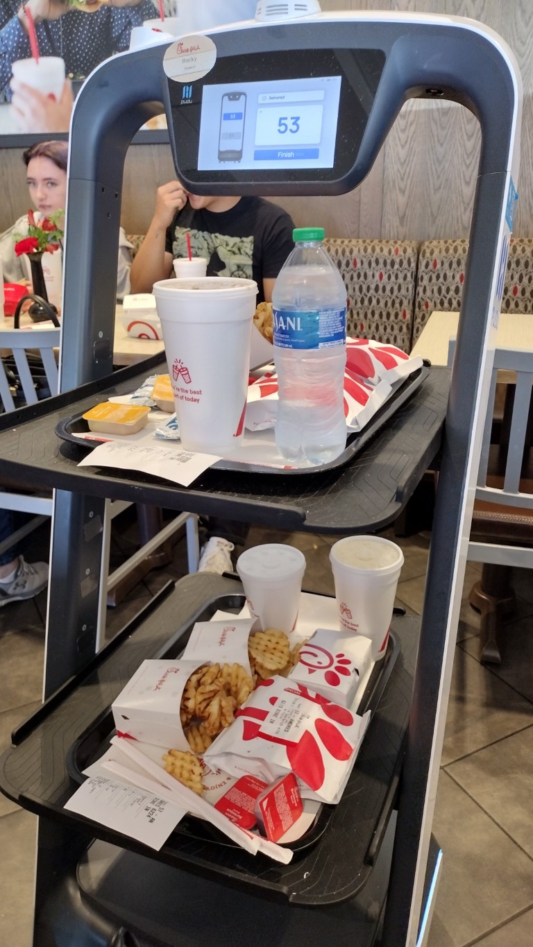 Before that we stopped at a Chick-Fil-A for a quick lunch. I am adamantly opposed to fast food restaurants, and haven’t eaten at any of them for two years come next April, if you excuse the occasional cup of coffee. Chick-Fil-A I’ll make an exception for, as I like their chicken sandwiches. That’s what Wife and I each had to eat. We were treated to a bonus and got to meet “Rocky”. Living the sheltered life that I do, this was the first time I’d encountered robot delivery devices in a restaurant. Or anywhere else, for that matter.