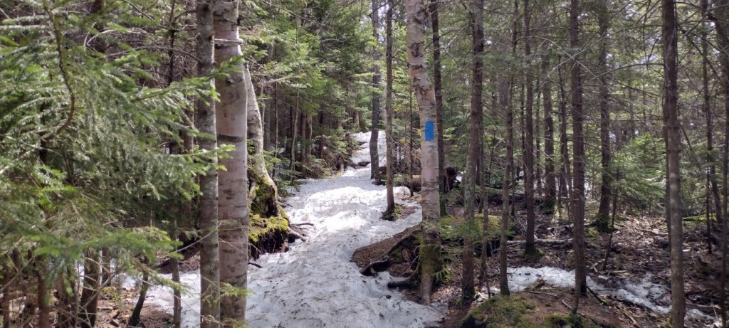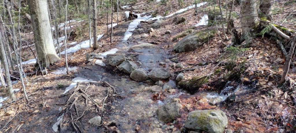 These wet conditions continued on for perhaps ¾ of a mile, and while sloppy, navigating the trail wasn’t hard. There were plenty of rocks to hop, and dry-ish patches here and there providing the way forward without having to walk in the stream itself. There was still no snow or ice. I noticed the trail markings need attention on Indian Head, as the yellow blazes seemed few and far between, and were faded to boot. When in doubt, I followed the flowing water.