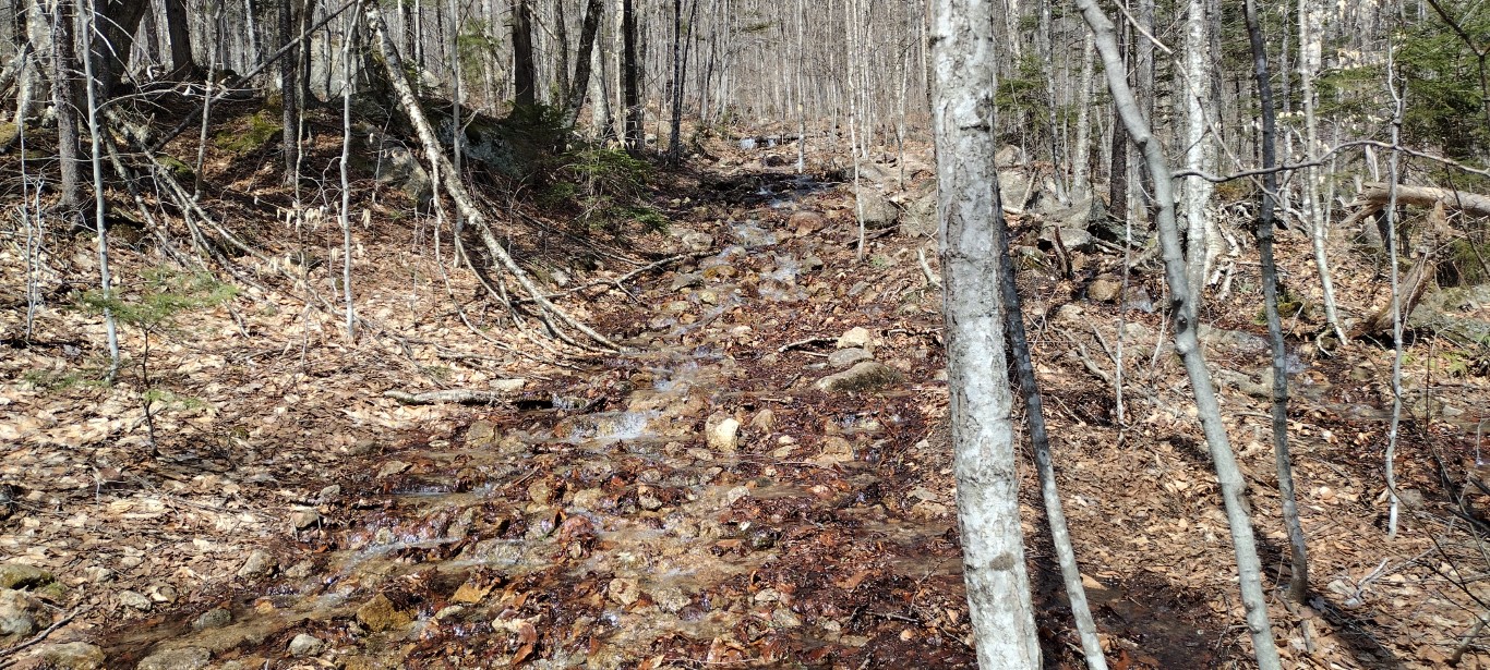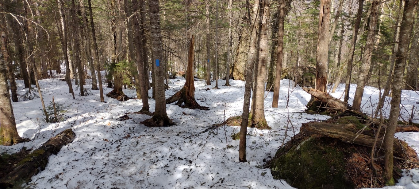 These wet conditions continued on for perhaps ¾ of a mile, and while sloppy, navigating the trail wasn’t hard. There were plenty of rocks to hop, and dry-ish patches here and there providing the way forward without having to walk in the stream itself. There was still no snow or ice. I noticed the trail markings need attention on Indian Head, as the yellow blazes seemed few and far between, and were faded to boot. When in doubt, I followed the flowing water.
