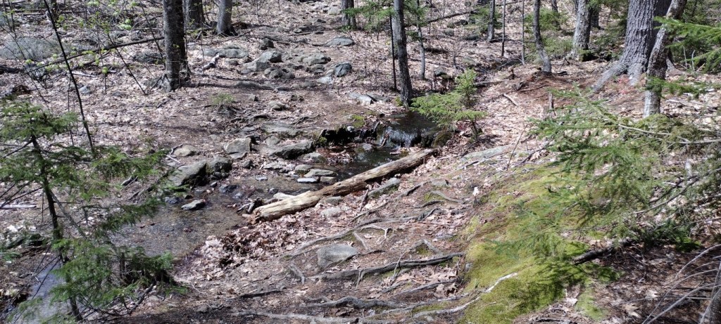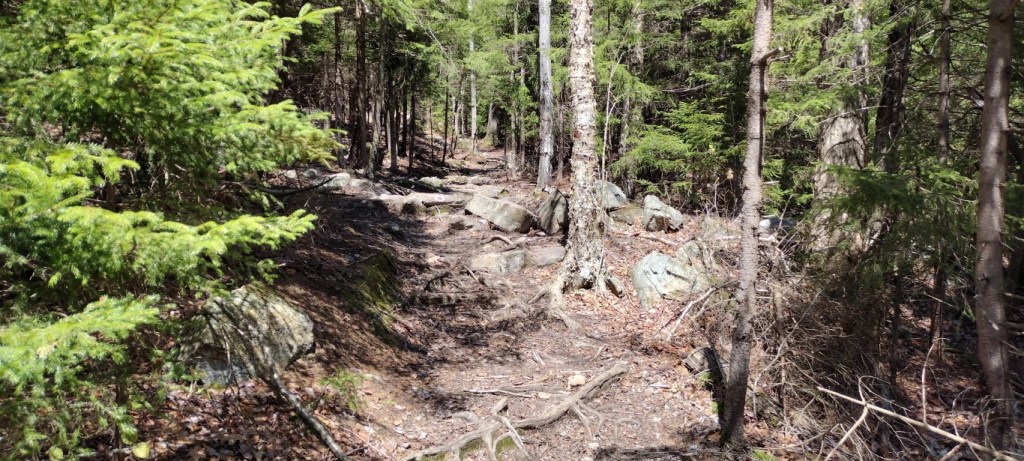 The trail continued along, following an old stone wall for a time. The grade was steadily up, but never severely. There were a couple of dips for water crossings, which were no issue at all anywhere on the mountain. Conditions were quite dry for the most part. A few muddy spots easily navigated around or through on the rocks was all.
