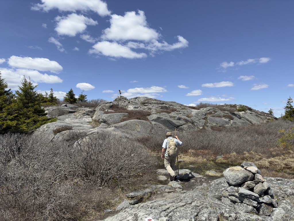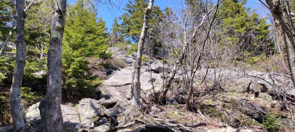The section of Pumpelly we traversed was typical of granite cones in the Northeast. Short trees, various mosses and small growth, along with dormant blueberry bushes. It was not long before we could see the summit, happily festooned with humans enjoying the bright, sunny day.
