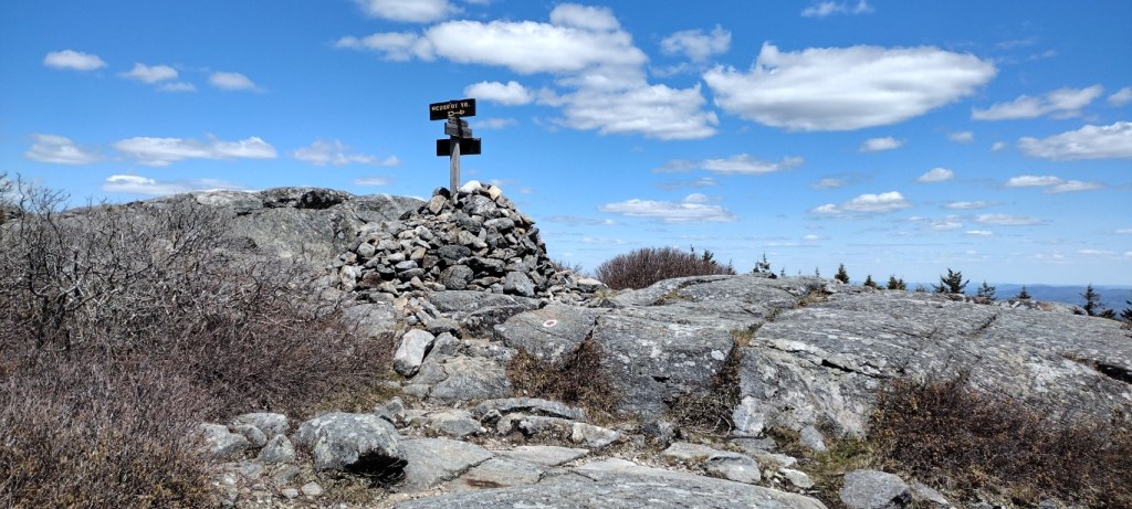 We came to the last junction of our hike when the Red Spot ended at the Pumpelly Trail. There’s a very large cairn with an embedded signpost, directing you to the summit that’s only ⅓ mile away now.
