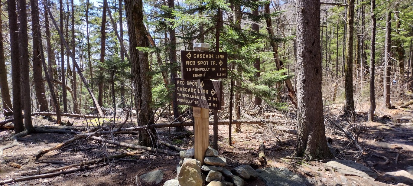 We came to the last junction of our hike when the Red Spot ended at the Pumpelly Trail. There’s a very large cairn with an embedded signpost, directing you to the summit that’s only ⅓ mile away now.