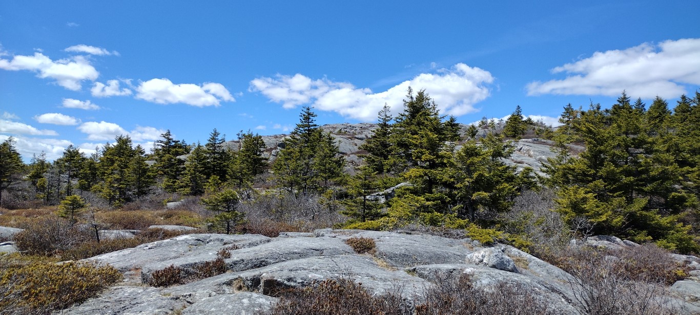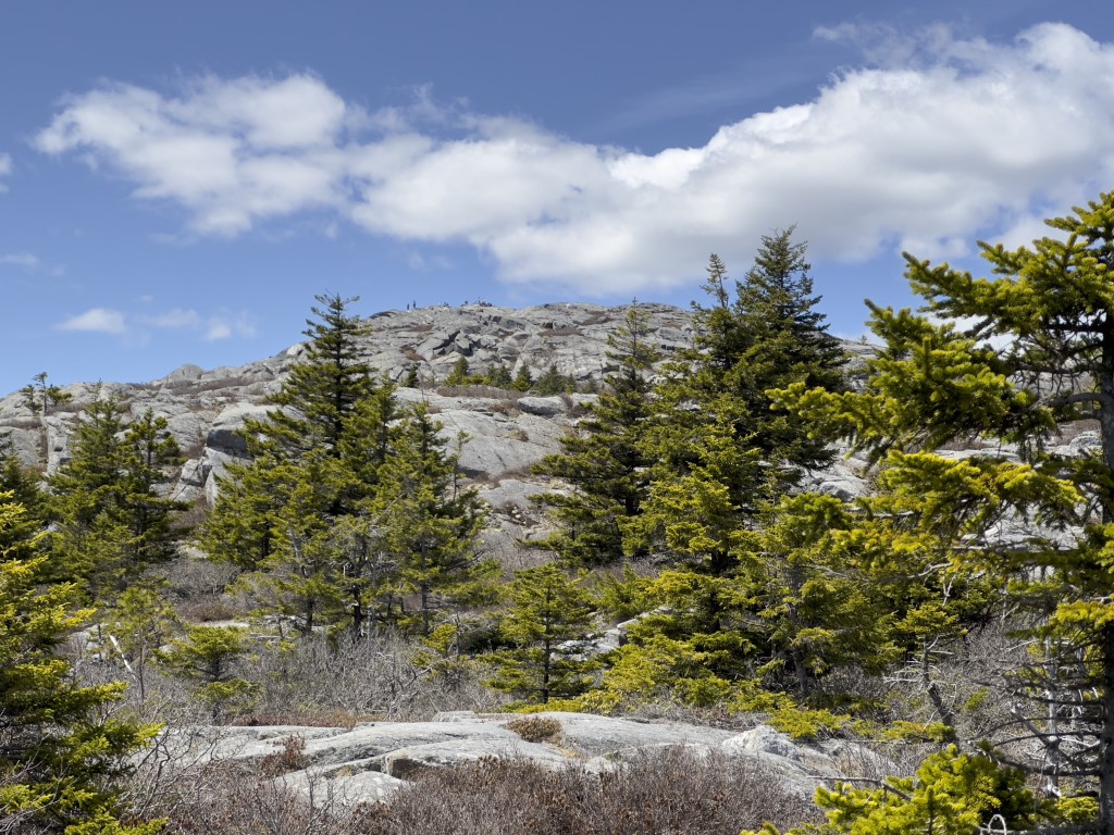 The section of Pumpelly we traversed was typical of granite cones in the Northeast. Short trees, various mosses and small growth, along with dormant blueberry bushes. It was not long before we could see the summit, happily festooned with humans enjoying the bright, sunny day.