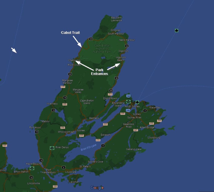 Arriving at the park mid-morning we made a quick stop at the Visitor Center to pay the nominal entry fee. Then Wife deposited me at the trailhead. She went back to Cheticamp for the museum and shopping. I walked the trail- it was brilliant. There was no rain until a light shower appeared just as I was completing the hike. A link to that video is at the end of this post.