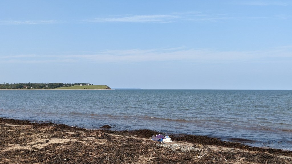 We followed the St. Mary’s for a time. By now the day had become bright and clear, and very warm- in the 70s. Not bad for late September in the Maritimes. We made a final stop at Pomquet Beach before pressing on to Port Hawkesbury. There were folks swimming in the 60°F water. We did not swim here, either.