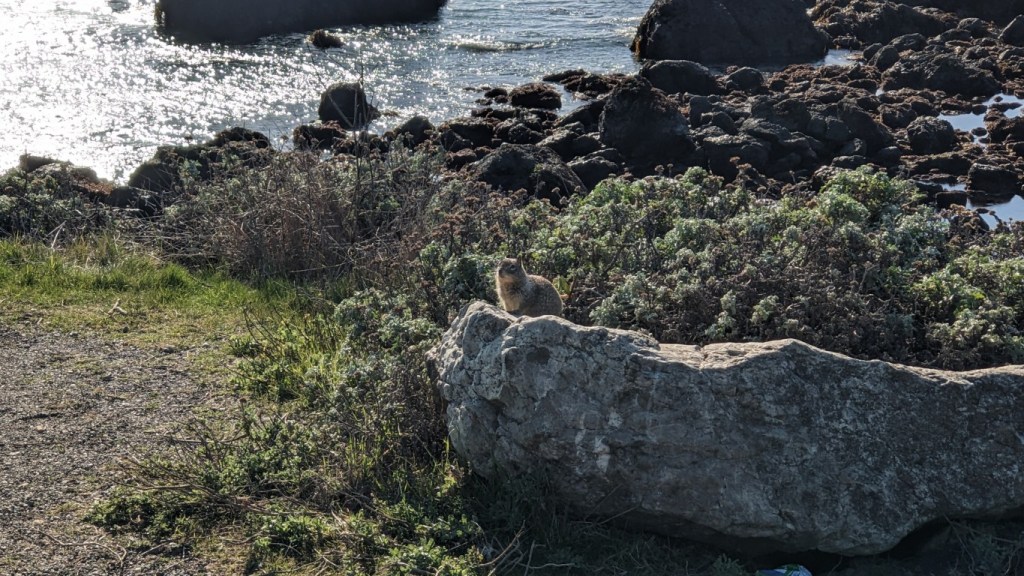 We didn’t have to wait very long. Almost immediately the road returned to running along the coast, and the views were spectacular. We stopped at several turnouts to admire the sand, waves and water. We watched a hawk floating in the oncoming breeze, and we met a beach squirrel.