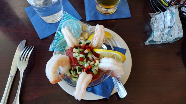 Wife had a sandwich while I went with a cup of clam chowder and a shrimp cocktail. Shrimp was good. Chowder tasted like Snow’s out of a can. But the view was great, and we saw an otter doing the backstroke in the harbor while we enjoyed our food.