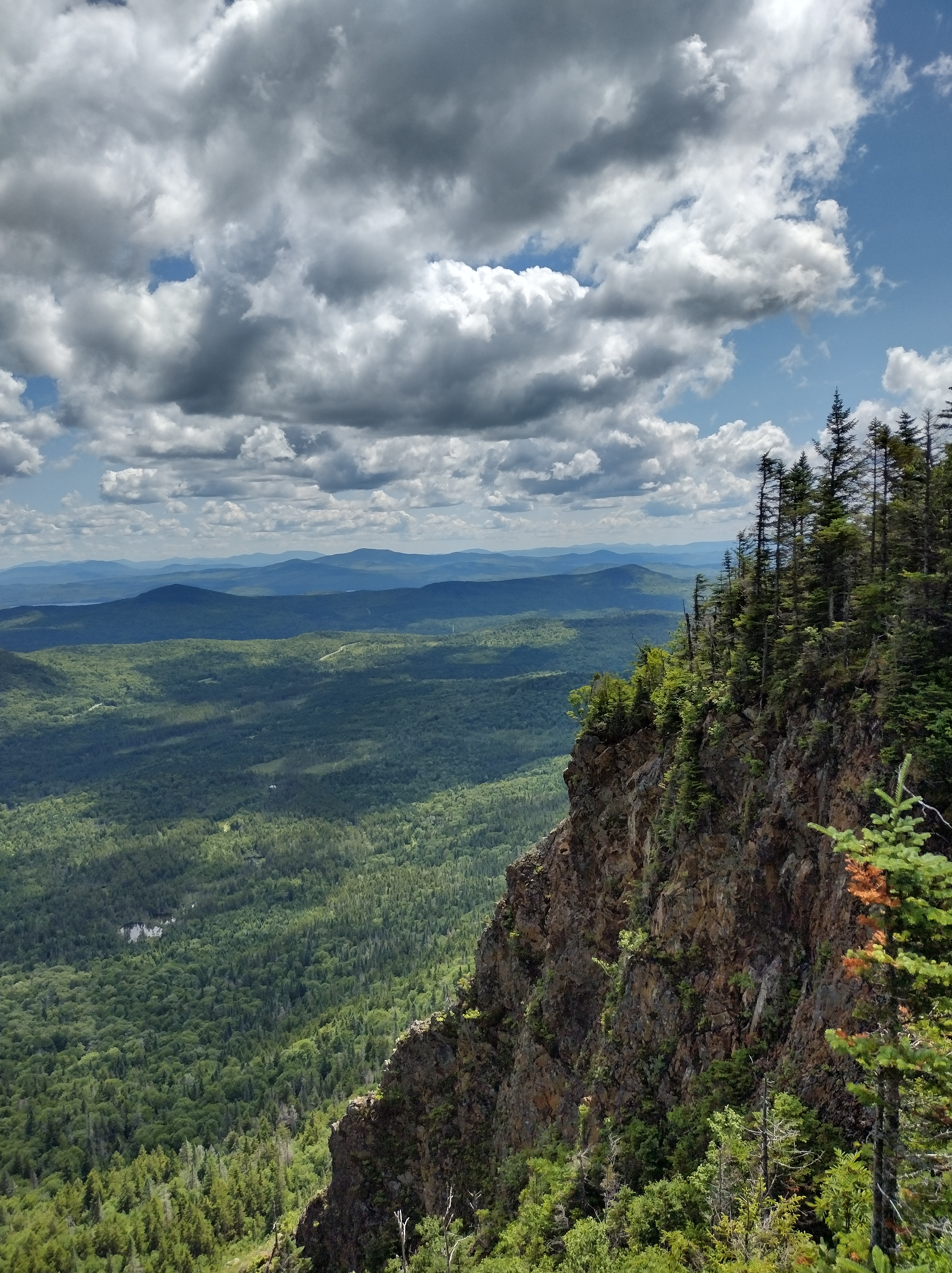 Once on the summit plateau, there are a couple of sealed up camp buildings along with the tower. There’s a short trail off to the east labeled “Overlook”, so I thought I’d take a look over there before climbing up the fire tower. The detour paid off, for the short trail ended up at a magnificent view from the cliffs on the northeast side of the mountain.