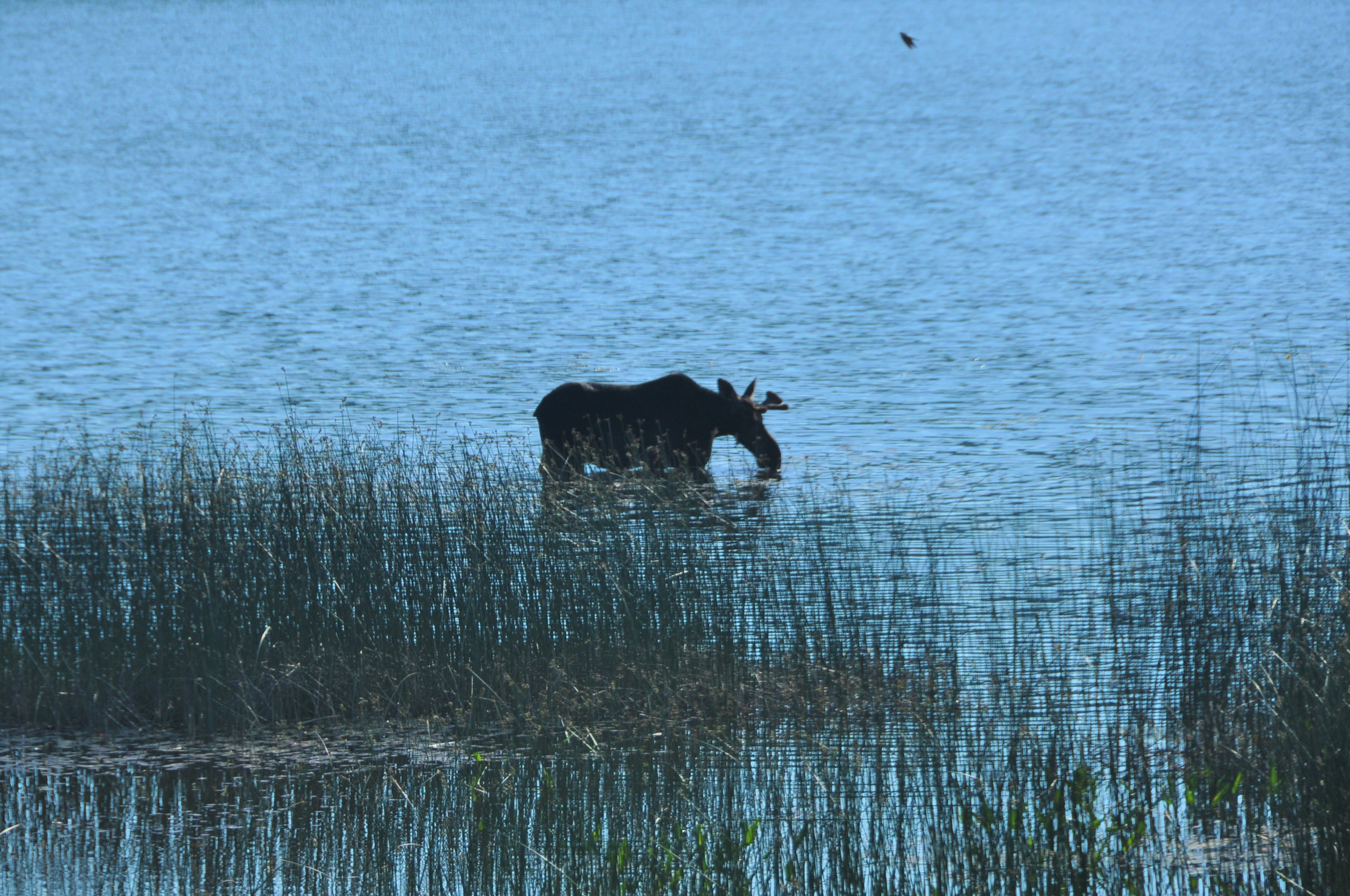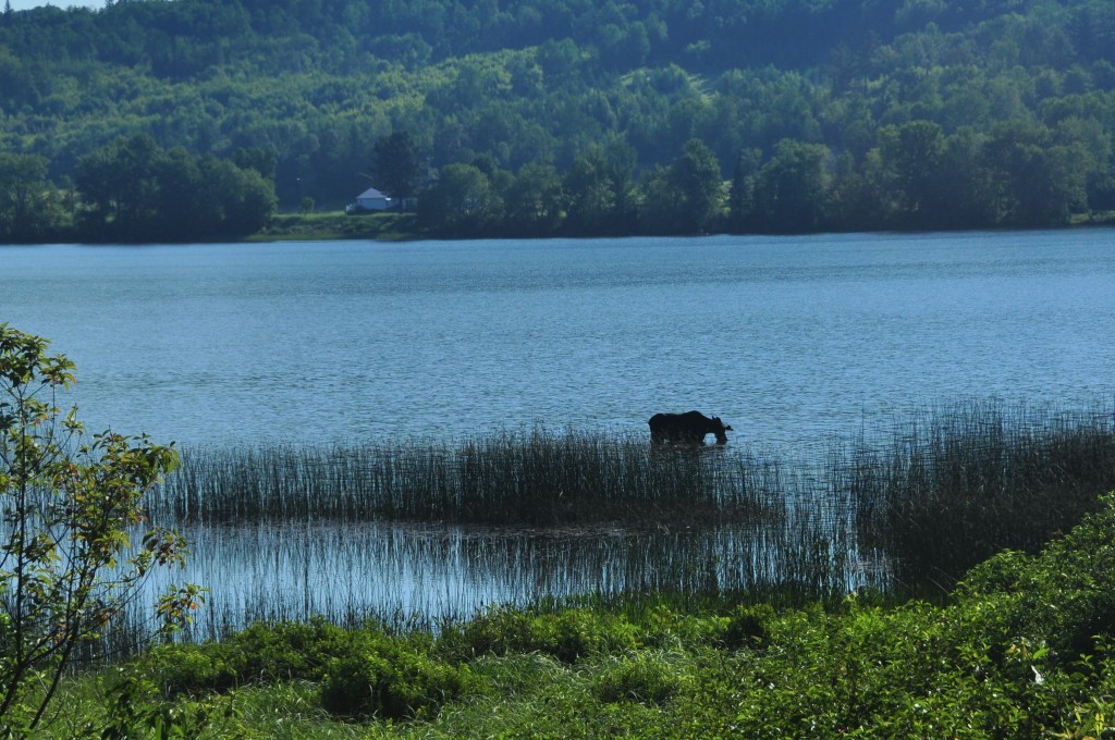 Recently I related my first moose encounter in Vermont, and included a couple of cell phone photographs. That day I took a few shots with a better camera and lens, and last night finally had the chance to see what they looked like. Here’s a couple of them: