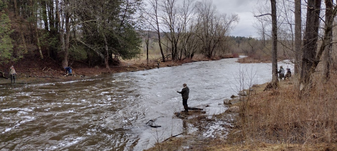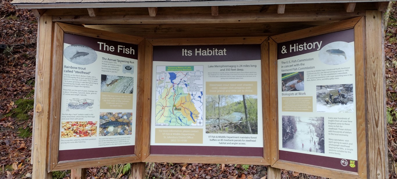 Each year about this time rainbow trout from Lake Memphremagog migrate upstream and you can see them jumping through the cascades and nickpoints as they head to spawning grounds. Like the sea-run rainbows in the Pacific Northwest, they’re called “steelhead”, although these are nowhere near as large as their western cousins.