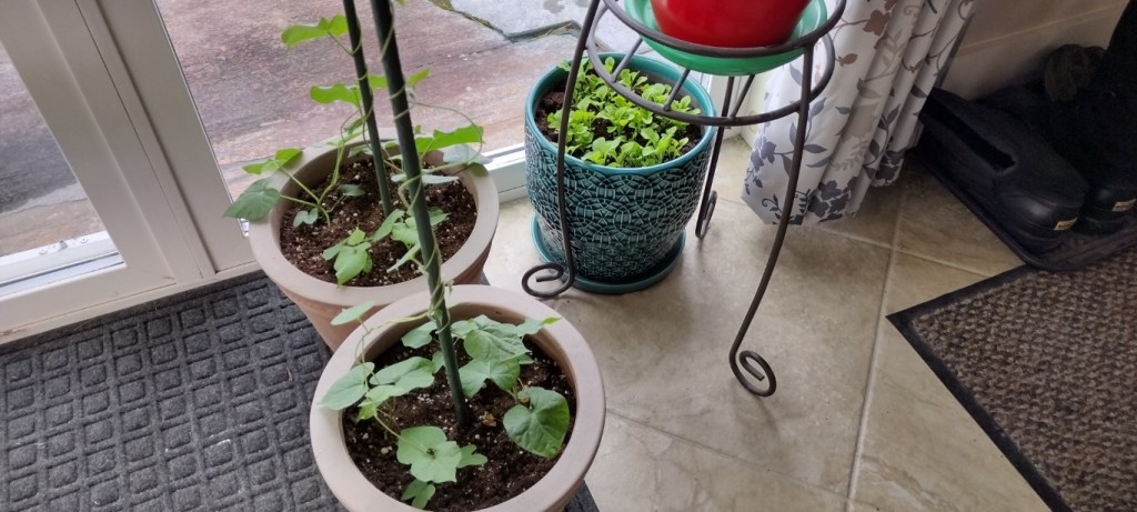 The potted flowers are all doing well, with the baskets starting to catch up. The Morning Glory plants are way ahead of where I thought they’d be now.