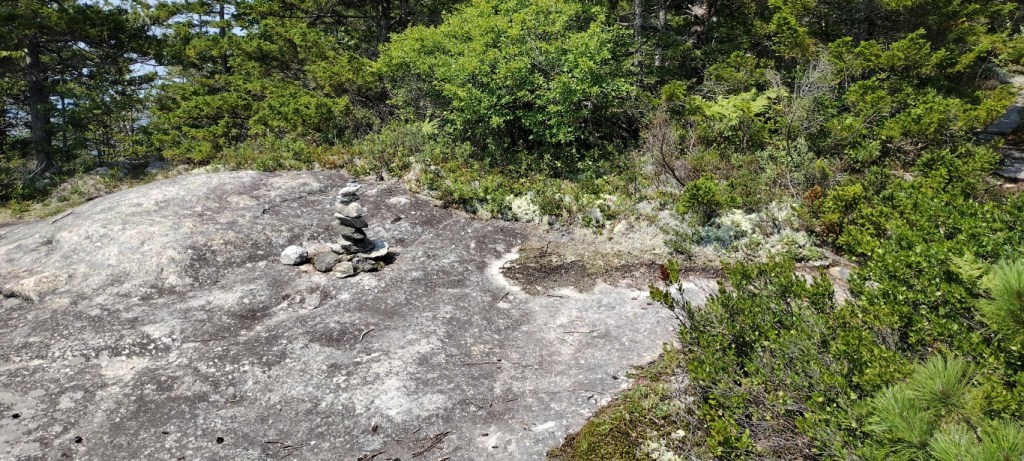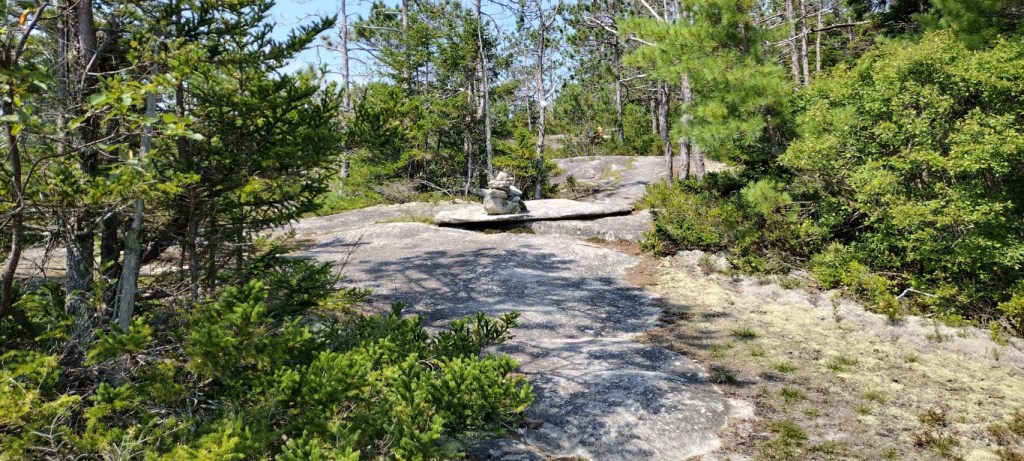 The top now being very close, there was a brief walk through a small wooded spot, and then some more ledge walking until the final stretch to the summit. There is a sharp right turn for the summit that’s easy to miss. Turn hard right at the cairn pictured below. There is no other sign.