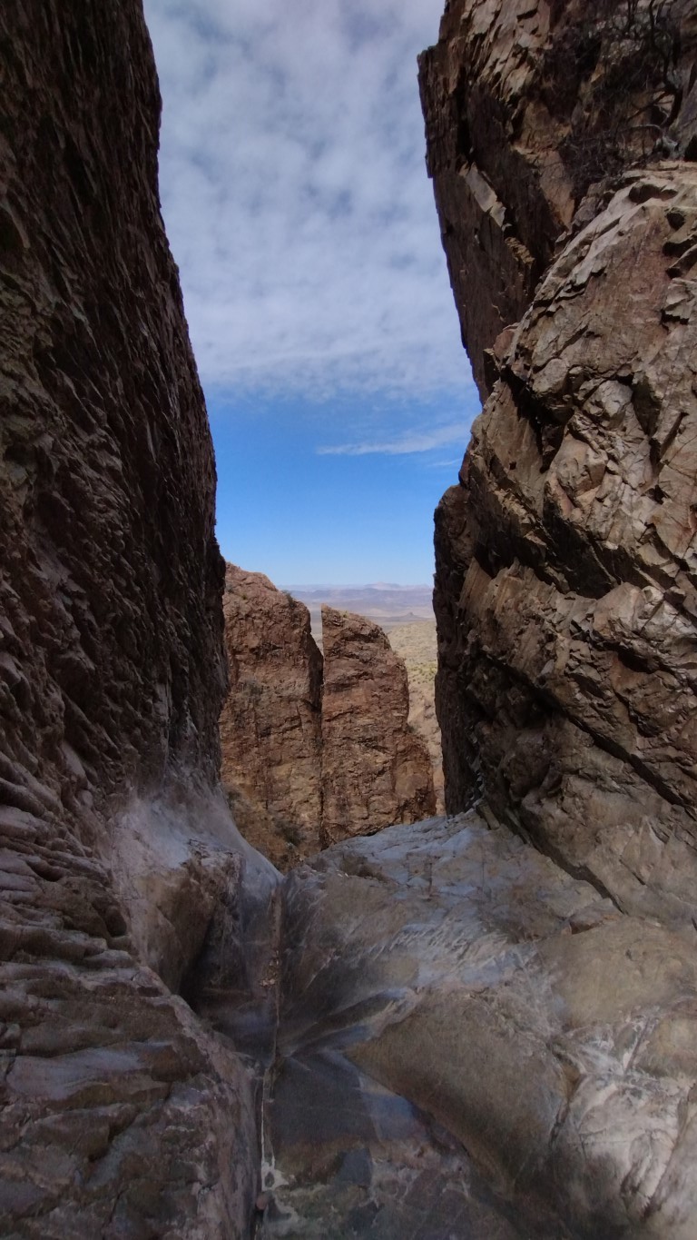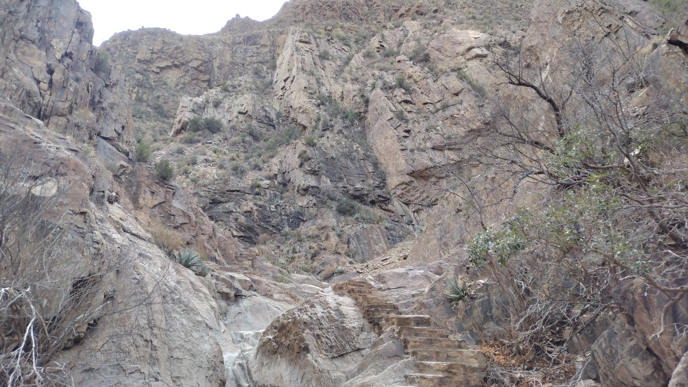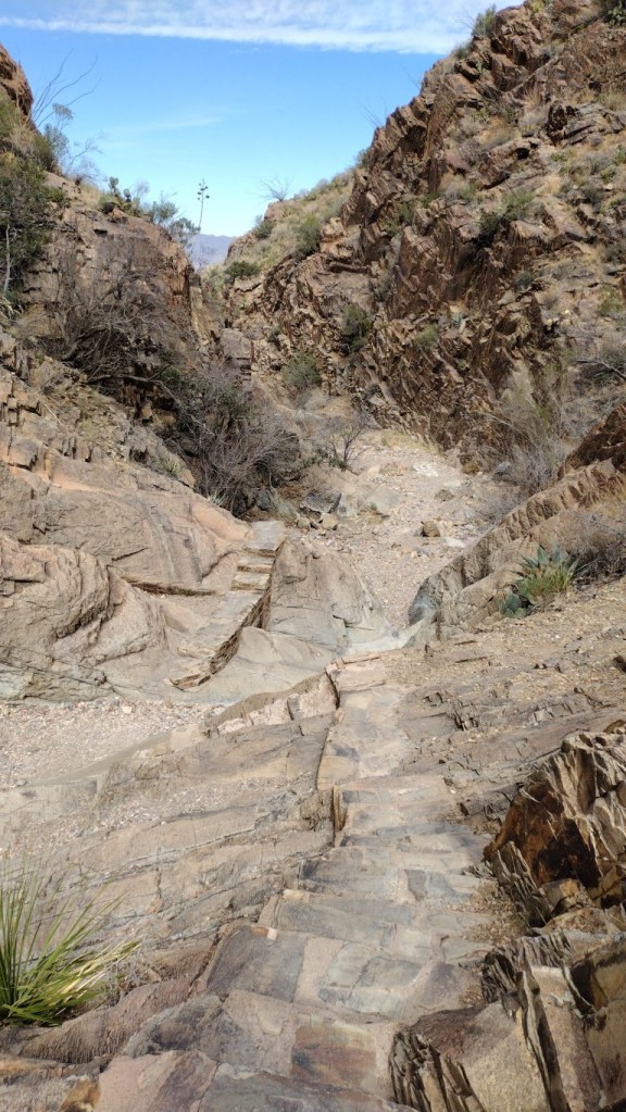 and eventually the trail became a wash, a dry stream bed that funneled the rains down and through the Window at its end. As I approached the end of the trail, there were a few up and down sections where stairs had been built into the sides of the stream bed. They made the passage easier, and safer.