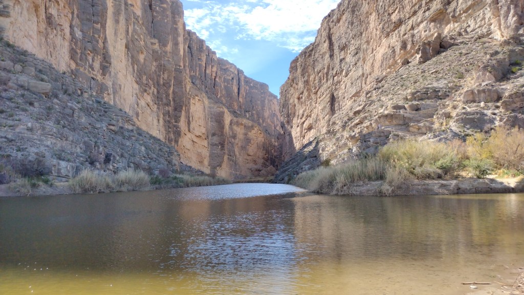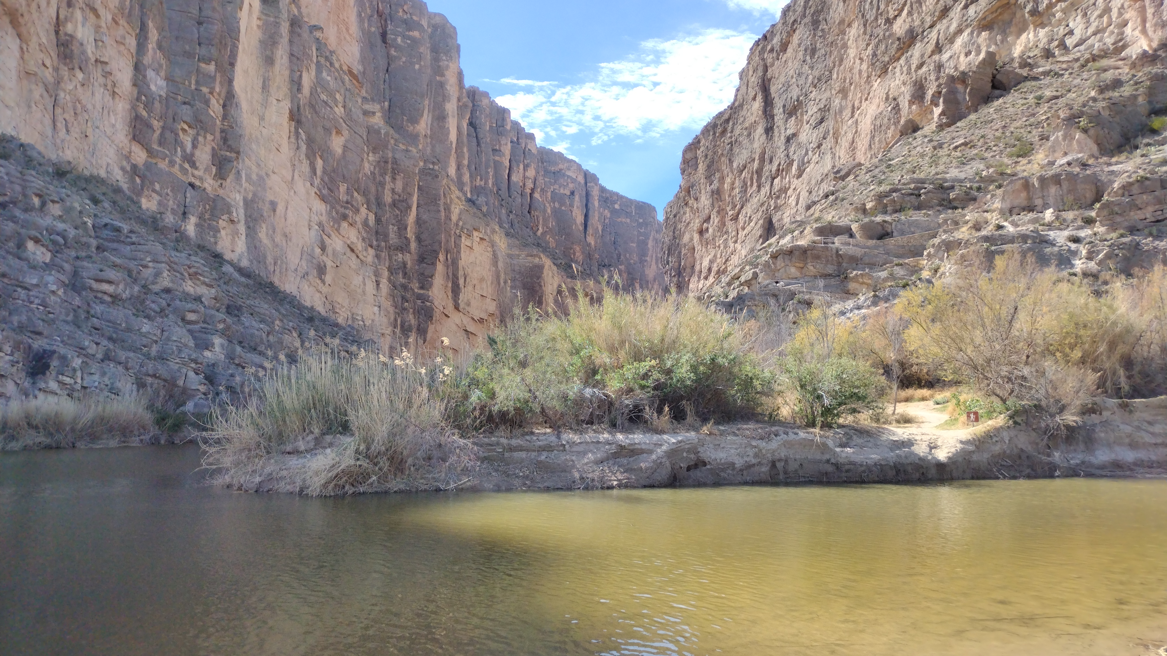 We headed over to a different section of the park by following the Ross Maxwell Scenic Drive all the way down to the Rio Grande. Here we were able to walk a couple hundred yards and get right up on the river at Santa Elena Canyon. The sheer wall across the river was the beginning of Mexico, and it was imposing. The Rio Grande, however, was not. Here at this place it was a very small river. The water level was low. We saw a corresponding trail head across the river on the Mexican side.