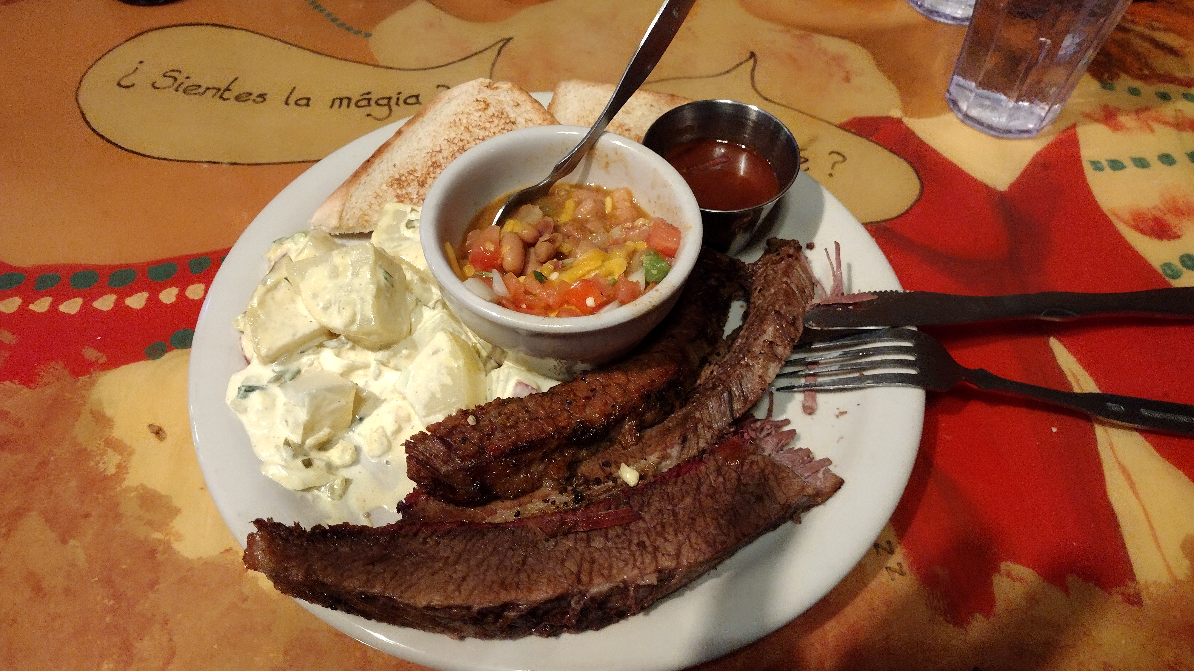 I had an excellent brisket plate with pinto beans and German potato salad, while Wife had a good looking cheeseburger. And yes, the food was that good- worth the wait.